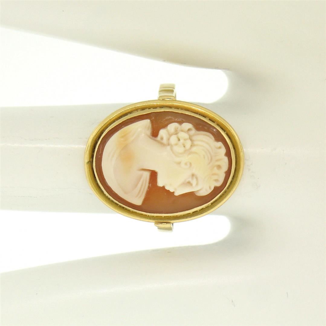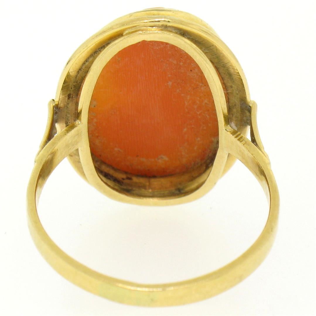 One Vintage 18k Yellow Gold Carved Shell Cameo Ring w/ Simple Polished Frame Sz 6.5. Item Details: Material: 18k Solid Yellow Gold, Weight: 3.7 Grams, Stone(s): (1) Genuine Carved Shell Cameo - Oval Shape - Bezel Set - 12.56x16.10mm, Ring Size: 6.5 (We can custom size this ring.), Ring Width: 19.00mm, Ring Height: 6.29mm rise off the finger, Condition: Vintage piece. Excellent condition!