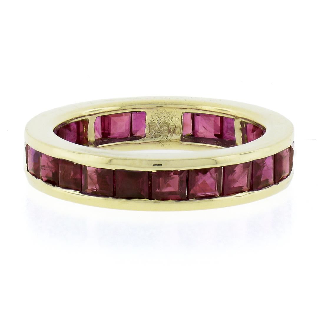 A solid 18k yellow gold eternity band ring, with GIA graded 24 square cut natural rubies (3ctw). The ring is size 6.75, weighs a total of 5.34 grams, and measures 4.43mm wide. Comes with all original relevant certifications