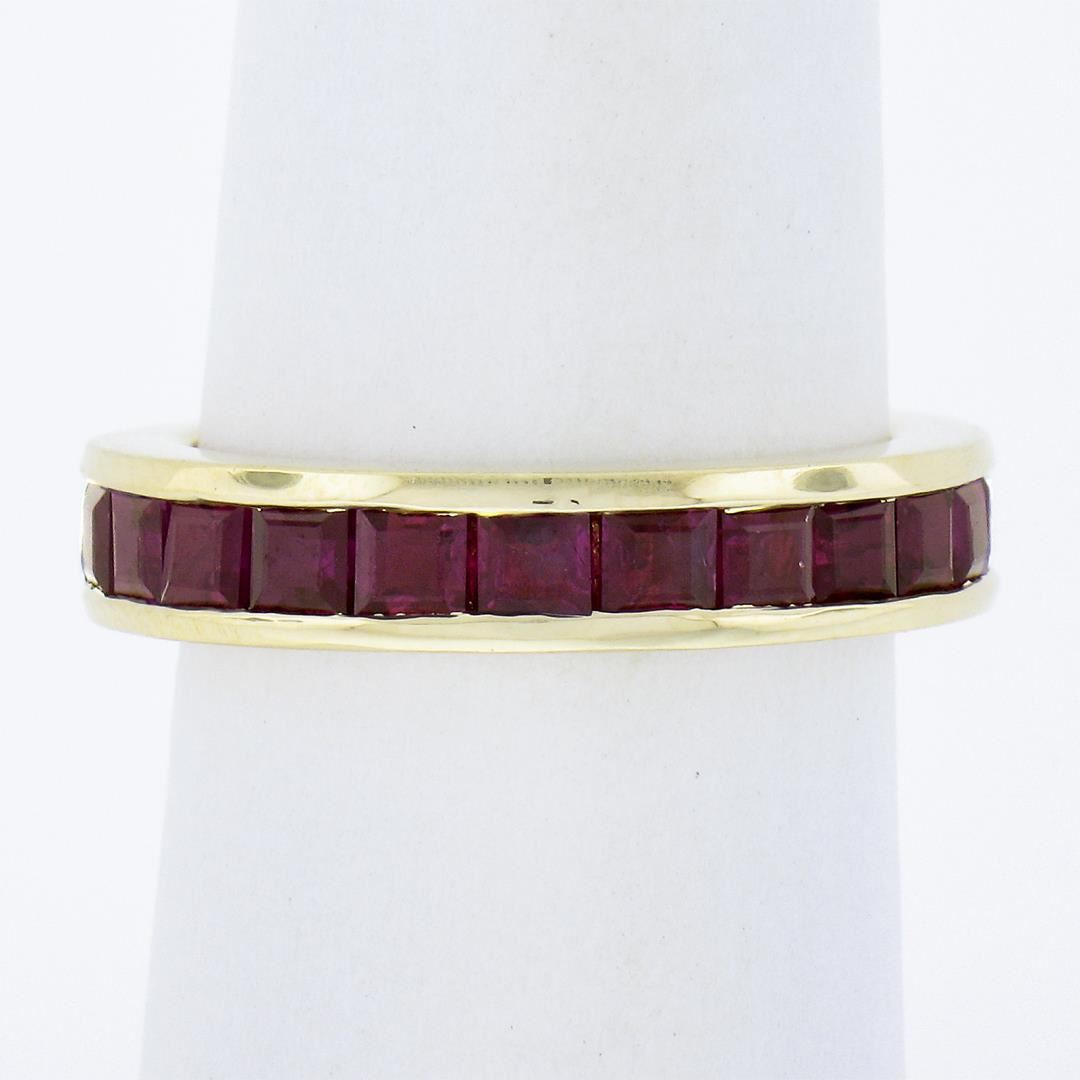 A solid 18k yellow gold eternity band ring, with GIA graded 24 square cut natural rubies (3ctw). The ring is size 6.75, weighs a total of 5.34 grams, and measures 4.43mm wide. Comes with all original relevant certifications