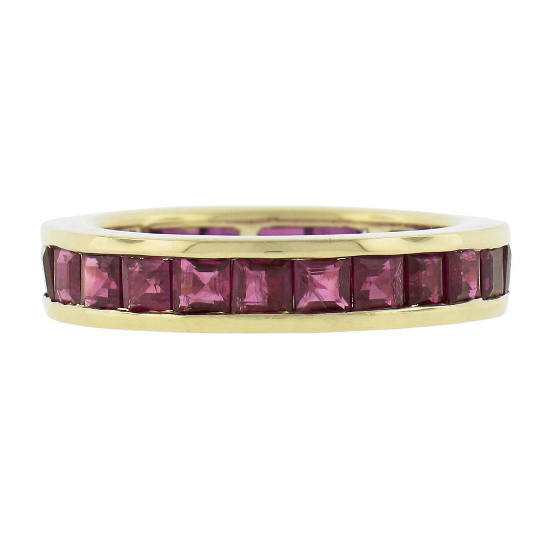 A solid 18k yellow gold eternity band ring, with GIA graded 24 square cut natural rubies (3ctw). The ring is size 6.75, weighs a total of 5.34 grams, and measures 4.43mm wide. Comes with all original relevant certifications