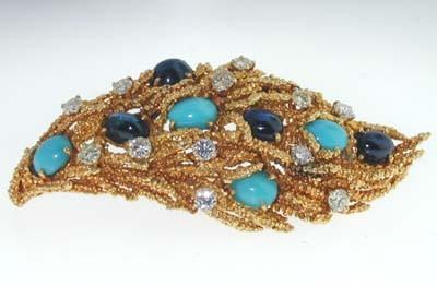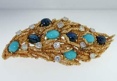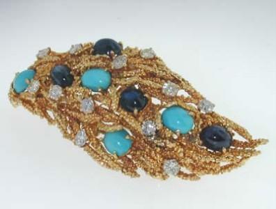 18k Yellow Gold Diamond, Cabochon Sapphire, Turquoise Pin. Pin's weight is 33.3 grams. The measurements of each Cabochon sapphire: 6x4mm. The measurements of each Turquoise:6x4mm. Total weight of Diamond: 2 cts, G color, VVS-2 clarity. The measurement of the Pin's surface is 65 mm long. 20 mm wide.