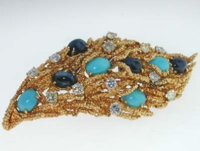 18k Yellow Gold Diamond , Sapphire, Turquoise Pin