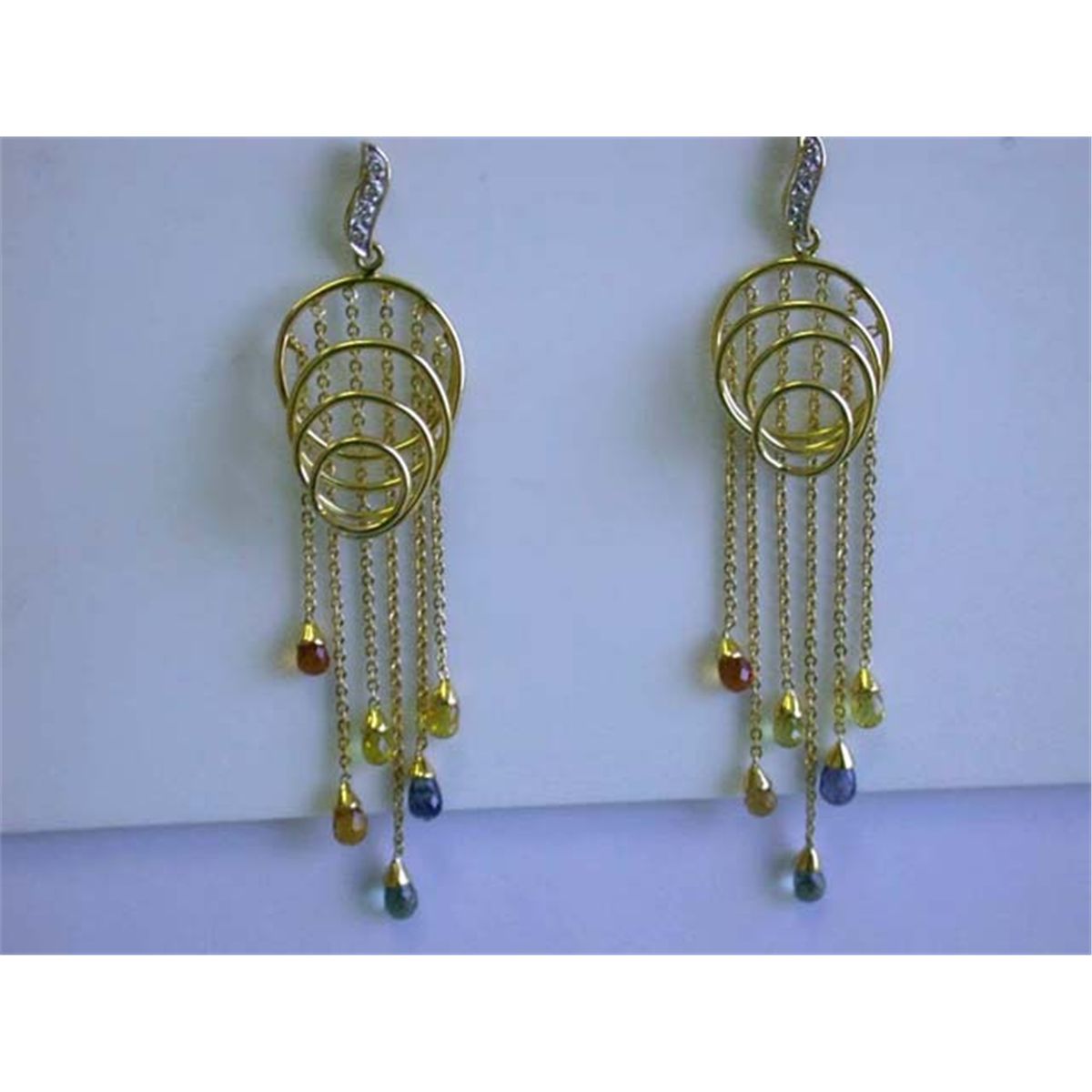 18k Yellow Gold Earrings. These are Dangling Earrings with Diamonds and Multi-colored Sapphire. The earrings are approximately 2.25 inches long and its weight - 5.60 grams.