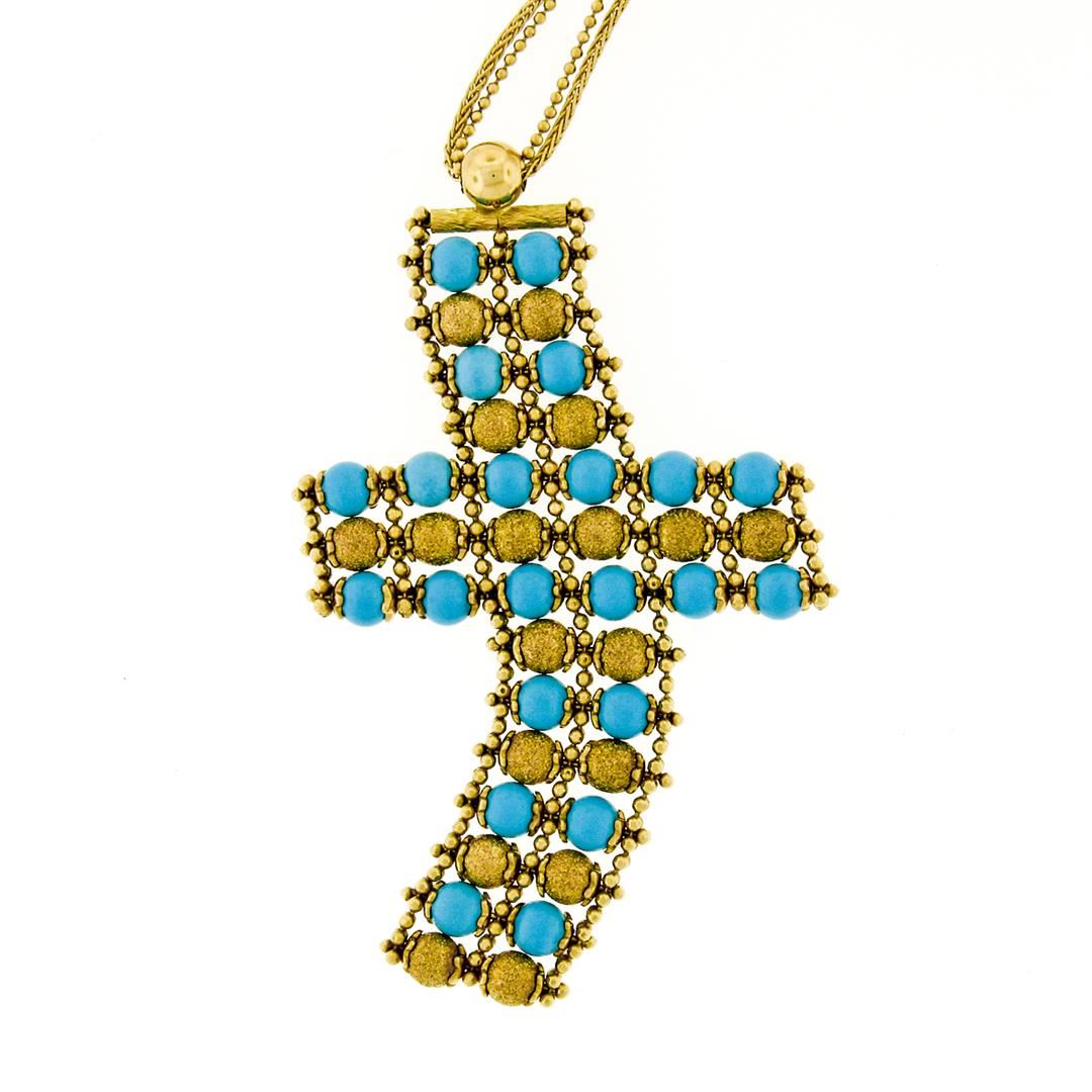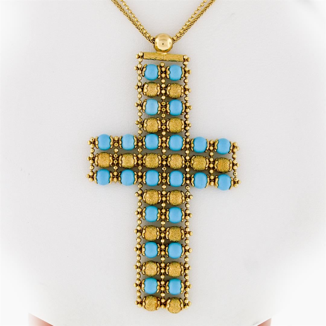One Estate 18k Yellow Gold Large Flexible Movable Turquoise Bead Cross Pendant w/ Chain. Item Details: Material: Solid 18k Yellow Gold, Weight: 18.80 Grams, Stone(s): (22) Natural Genuine Turquoise - Round Bead Cut - Robin's Egg Blue Color - 4.2mm (approx.), Chain Type: Dual Bead Link and Wheat Link Chains, Chain Length: 17.5 Inches, Clasp: Lobster Claw Clasp, Overall Width: 39.7mm (1.56"), Overall Height: 65.1mm (2.56"), Thickness: 4.2mm. Condition: Estate statement piece. Excellent condition and ready to wear.