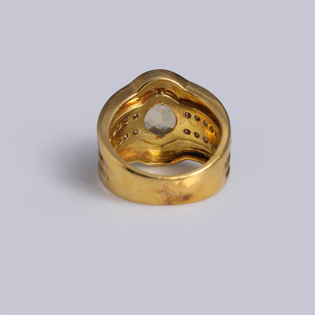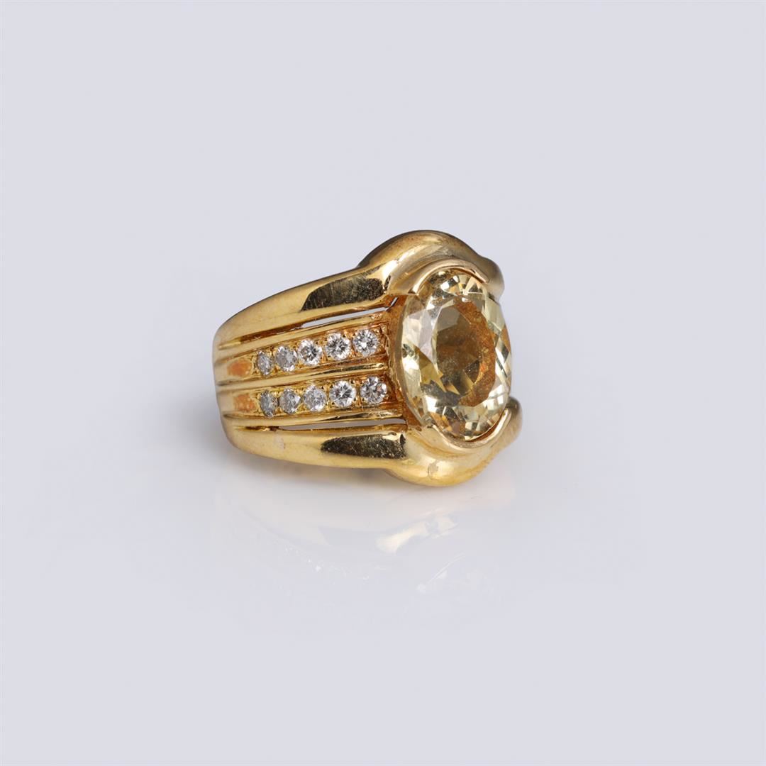 18k yellow gold ring; with large partial bezel set faceted oval cut heliodor (yellow barrel), each shoulder with two rows of five round white diamonds; gross weight 14.4 g, size 7