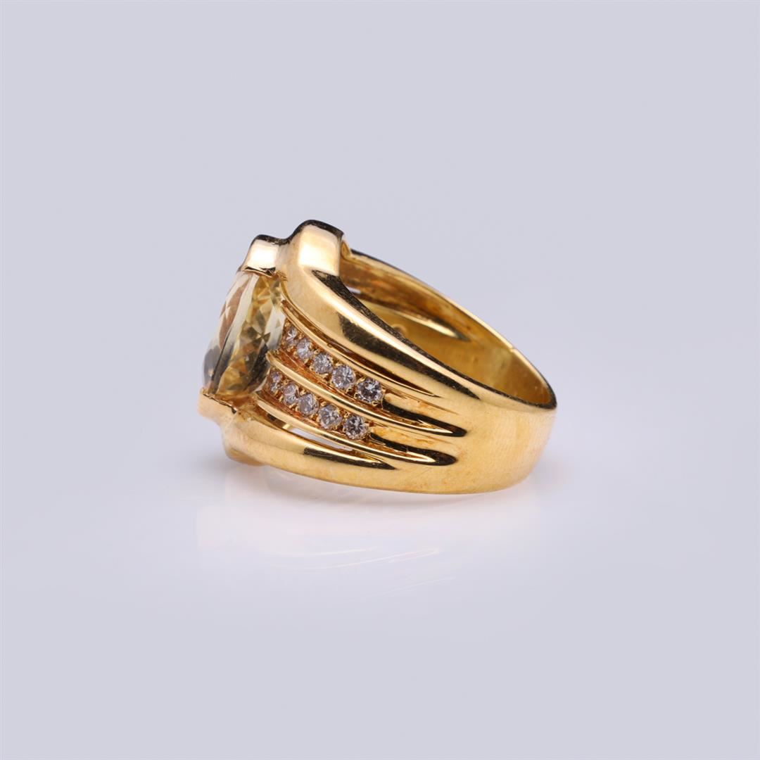18k Yellow Gold Heliodor & Diamond Ring containing one oval heliodor 12.5mm x 9.7mm weighing approximately 4.0cts. twenty round brilliant cut diamonds weighing approximately 0.40 cts. Total weight of ring is 14.6 gm. Estimated retail value $6,000.