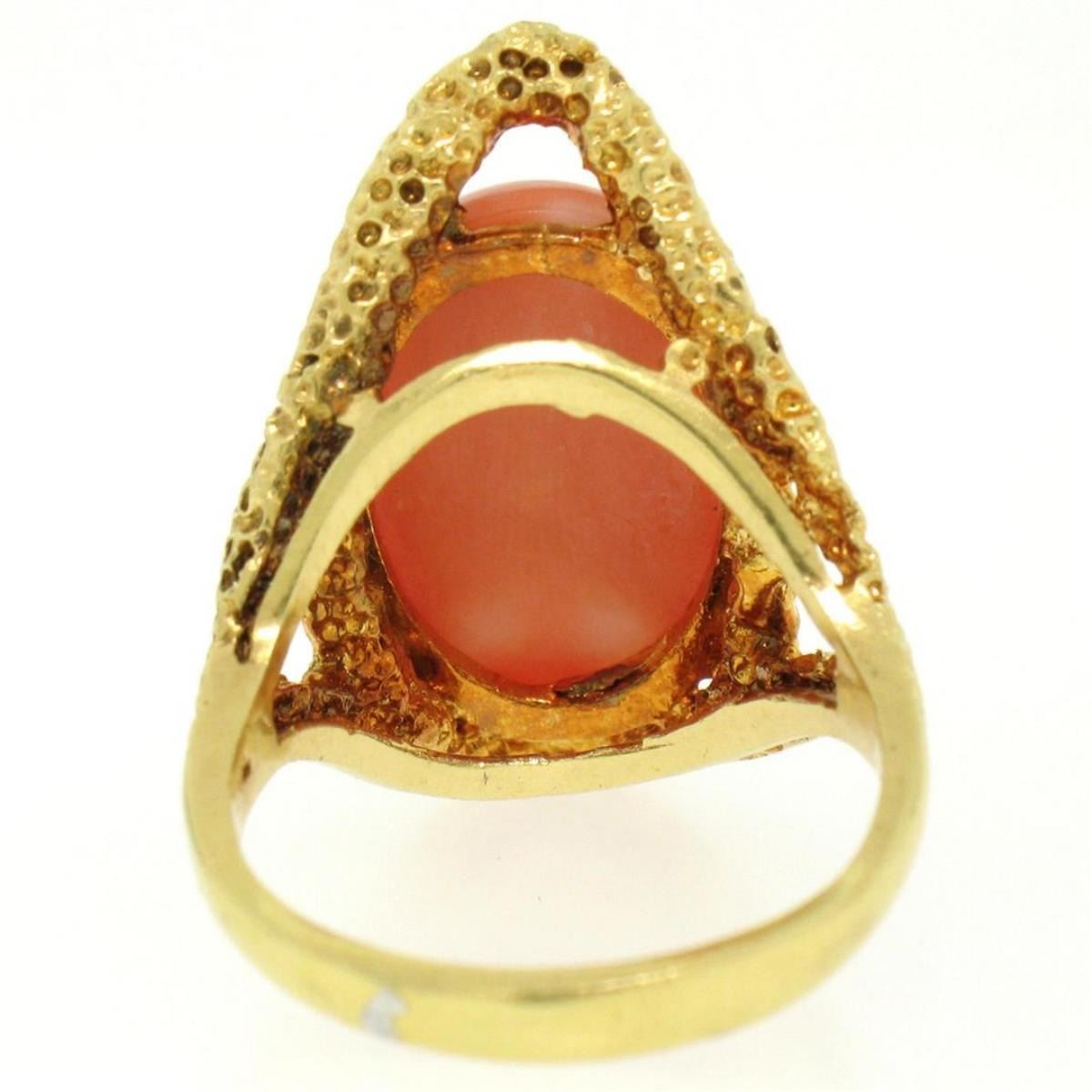 One Vintage 18k Yellow Gold Large Cabochon FINE Coral Nugget Textured Solitaire Ring. Item Details - Material: 18k Solid Yellow Gold, Weight: 9.70 Grams, Stone(s): (1) Natural Genuine Coral - Oval Cabochon Cut - Prong Set - Rich Pink/Peach Color - 18x12.5mm (approx.), Ring Size: 7.0, Ring Width: 25.5mm, Ring Height: 11.5mm rise off the finger, Condition: Vintage ring. Original patina has been preserved. Excellent condition!