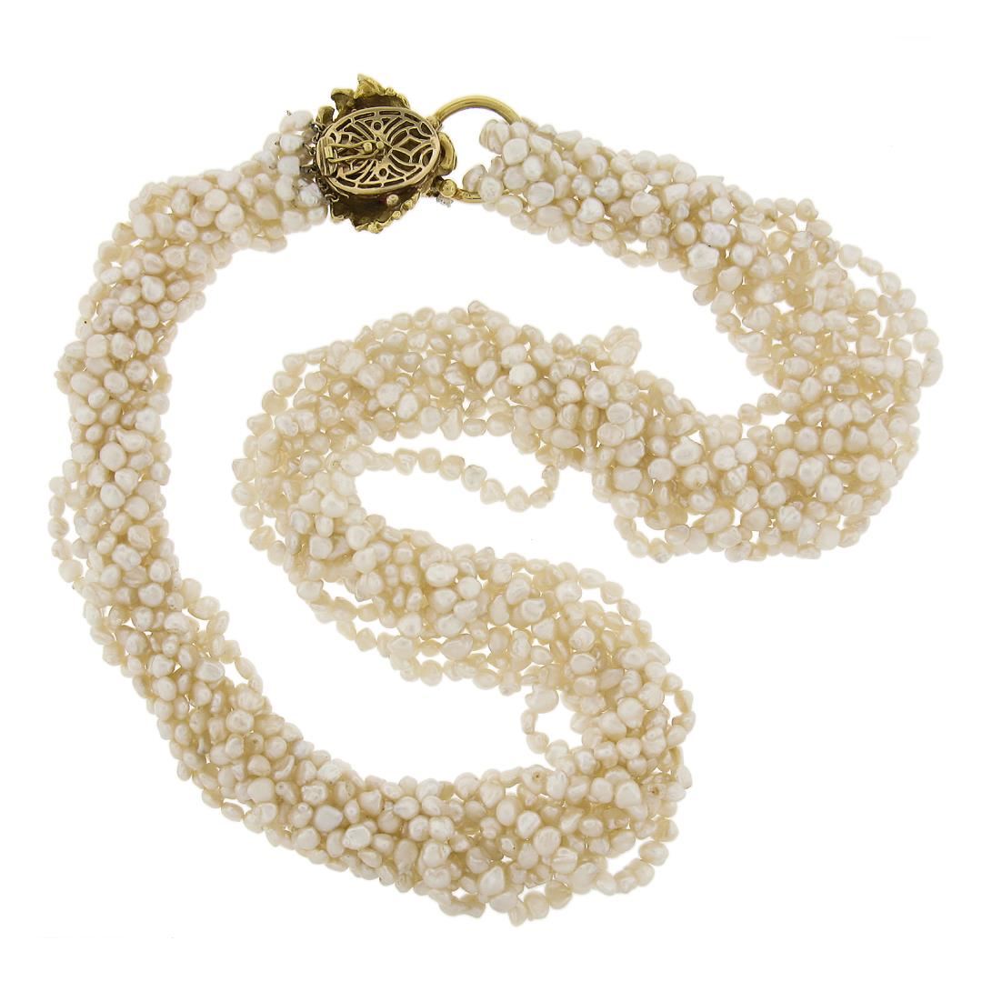 A multi strand necklace with 18k yellow gold lion head clasp, featuring numerous semi round cultured fresh water pearls , 2 round brilliant cut natural ruby (0.24ctw), and 2 round cut natural diamonds (F/G - VS1/VS2 ; 0.32ctw). 30 inch bead link chain, 266.55 grams total weight, clasp measures 34.4mm.