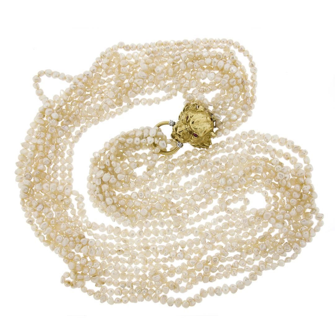A multi strand necklace with 18k yellow gold lion head clasp, featuring numerous semi round cultured fresh water pearls , 2 round brilliant cut natural ruby (0.24ctw), and 2 round cut natural diamonds (F/G - VS1/VS2 ; 0.32ctw). 30 inch bead link chain, 266.55 grams total weight, clasp measures 34.4mm.