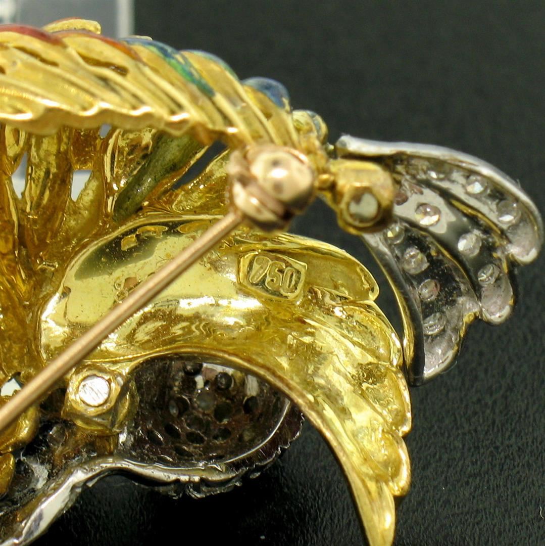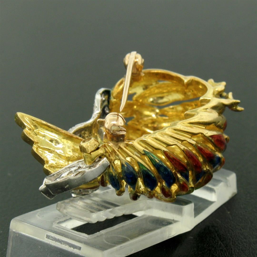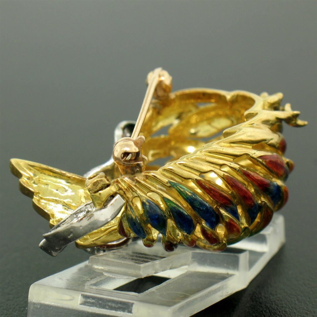 One Vintage 18k Yellow Gold Multi Color Enamel 46 Diamond Peacock Pin Brooch. Item Details: Material: 18k Solid Yellow Gold, Total Weight: 14.0 Grams, Stone(s): (46) Natural Genuine Diamonds - Round Single Cut - Pavé Set - VS1/VS2 Clarity - F/G Color - 0.46ctw (approx.), Overall Height: 22.06mm, Overall Width: 36.26mm, Overall Thickness: 15.45mm (not including the pin), Condition: Vintage piece. The enamel in 95% perfect and there's a little damage. However it is not noticeable but we are mentioning it for accuracy. Overall Great Condition.
