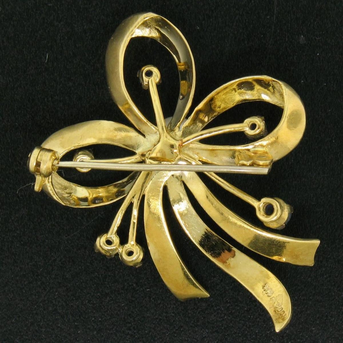 One Vintage 18k Yellow Gold Multi Ribbon Sapphire and Pearl Elegant Pin Brooch. Item Details: Material: Solid 18k Yellow Gold, Total Weight: 9.40 Grams, Stone(s): (6) Natural Genuine Sapphire - Round Brilliant Cut - Prong Set - Dark Blue Color - 0.75ctw approx., (1) Genuine Cultured Pearl - 5.90mm - White color with light pink overtone - Amazing Luster, Overall Height: 43.40 mm, Overall Width: 35.52 mm, Overall Thickness: 9.0mm not counting pin., Backing: Pin across the middle of the back with swiveling lock. Condition: Vintage piece w/ original patina preserved. Excellent overall condition.
