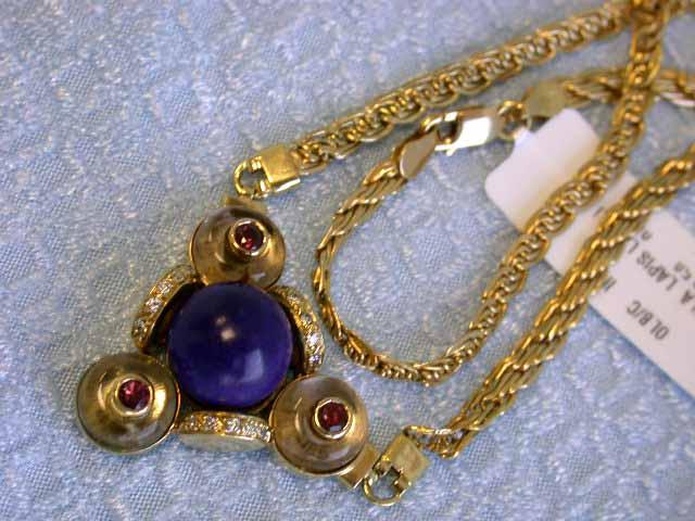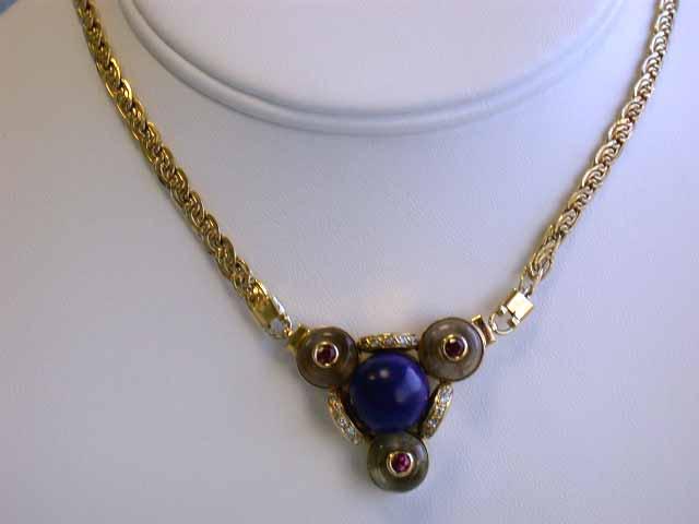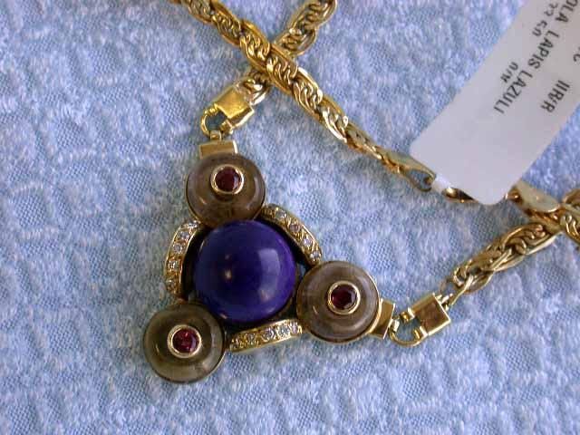 18k Yellow Gold Necklace. It has a 0.20 carat Diamonds in G color and SI clarity; 0.30 carat Rubies and 12 mm Lapis. The Weight is 18.50 grams and approximately 16 inches long.