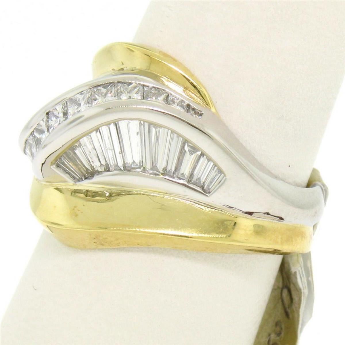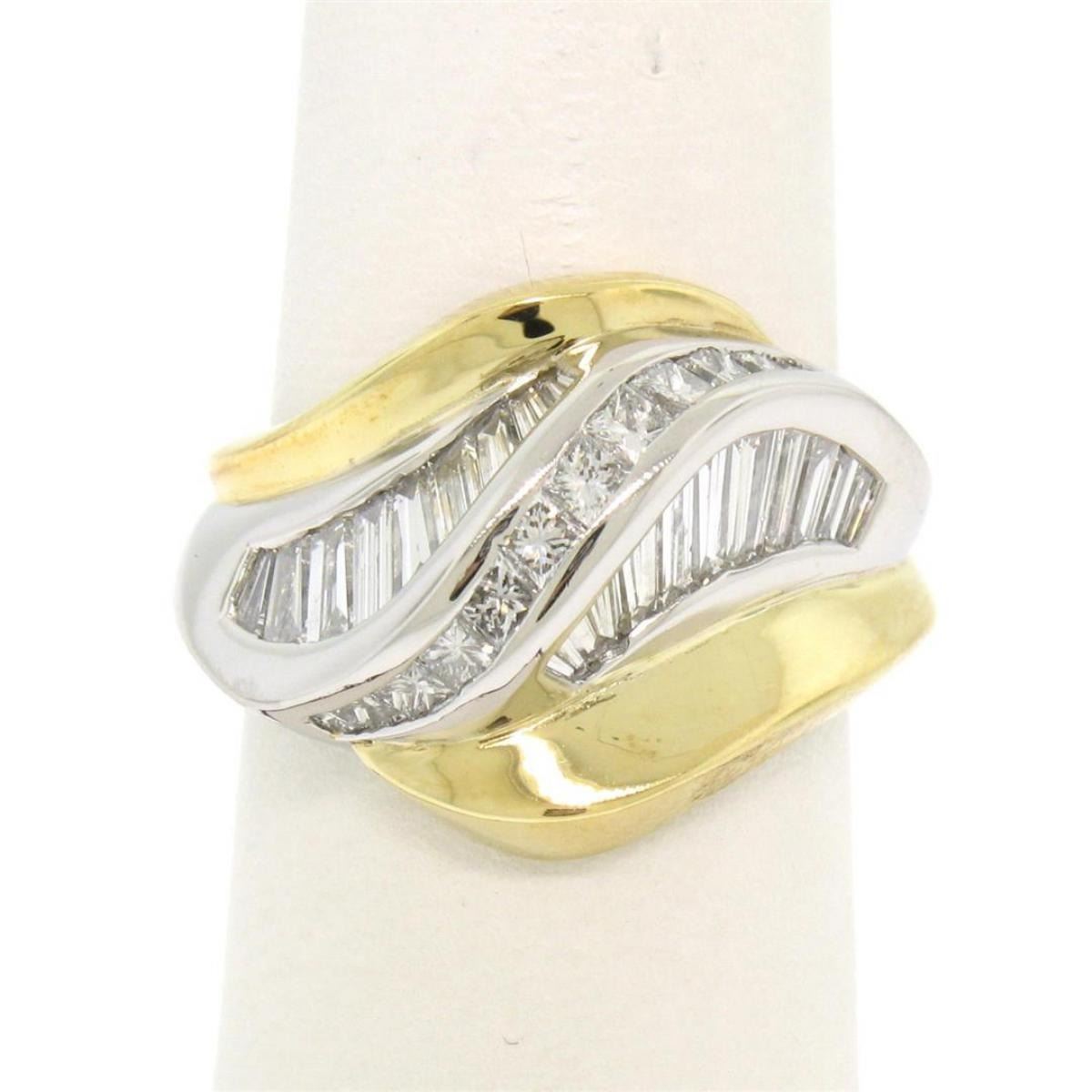 One 18k Yellow Gold & Platinum Wavy 2.50ctw F VS1 Baguette & Princess Diamond Ring. Item Details: Material: 18k Solid yellow gold and .950 Solid Platinum , Weight: 11.30 Grams , Stone(s): (20) Natural Genuine Diamonds - Baguette Cut - Channel Set - F Color - VS1 Clarity, (12) Natural Genuine Diamonds - Princess Cut - Channel Set - F Color - VS1 Clarity, Total Carat Weight: 2.50, Width: 16.0mm, Size: 7.0, Condition: Ring is in 100% Like new perfect condition.