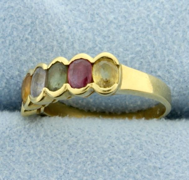 In 18 Yellow Gold. Contains natural topaz, citrine, white sapphire, spinal, rubelite, and quartz each with excellent clarity and a vibrant bright color. Gemstones are 5x3mm each, approximately 1.5ct total weight. Size 5 3.5g