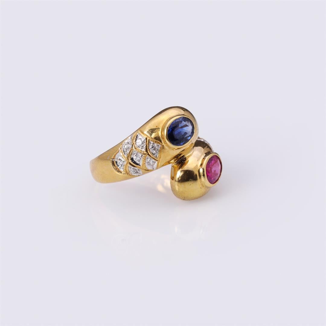 An interesting 18k yellow gold crossover ring by Utopia; bezel set to each side with faceted oval ruby and sapphire, each side with decorative panels containing seven claw set diamonds, the interior of the ring marked UTOPIA 18K; gross weight 6.3 g, size