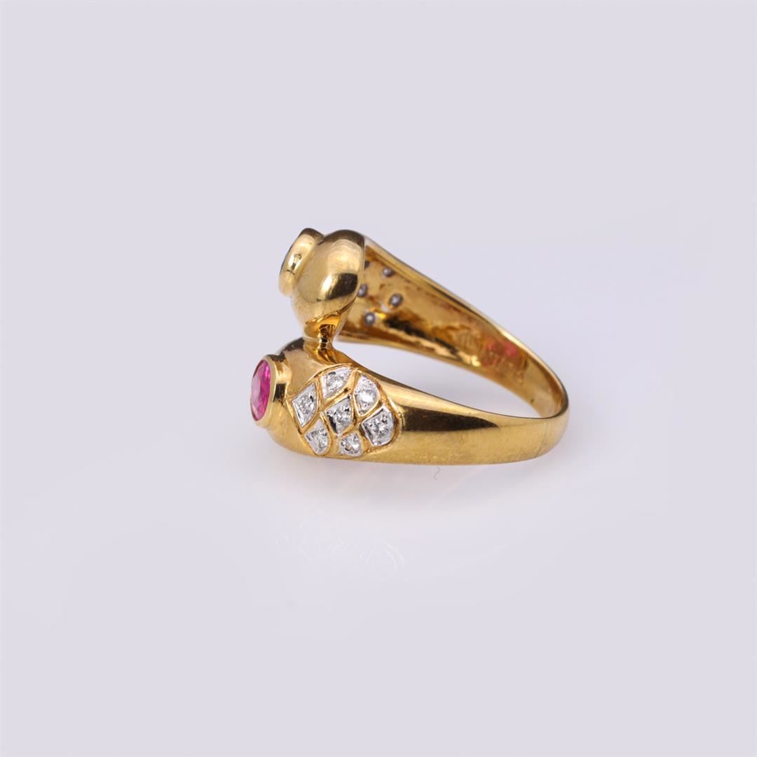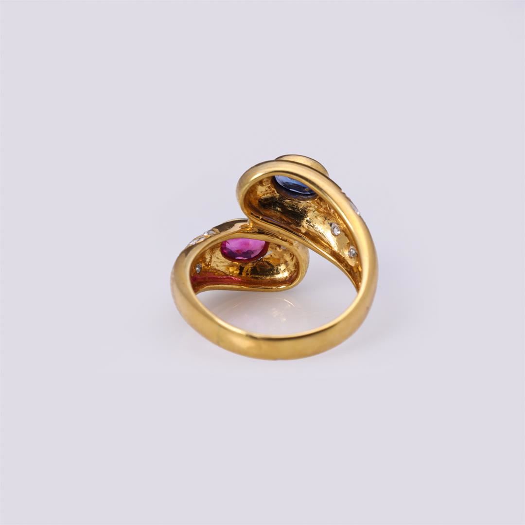 An interesting 18k yellow gold crossover ring by Utopia; bezel set to each side with faceted oval ruby and sapphire, each side with decorative panels containing seven claw set diamonds, the interior of the ring marked UTOPIA 18K; gross weight 6.3 g, size