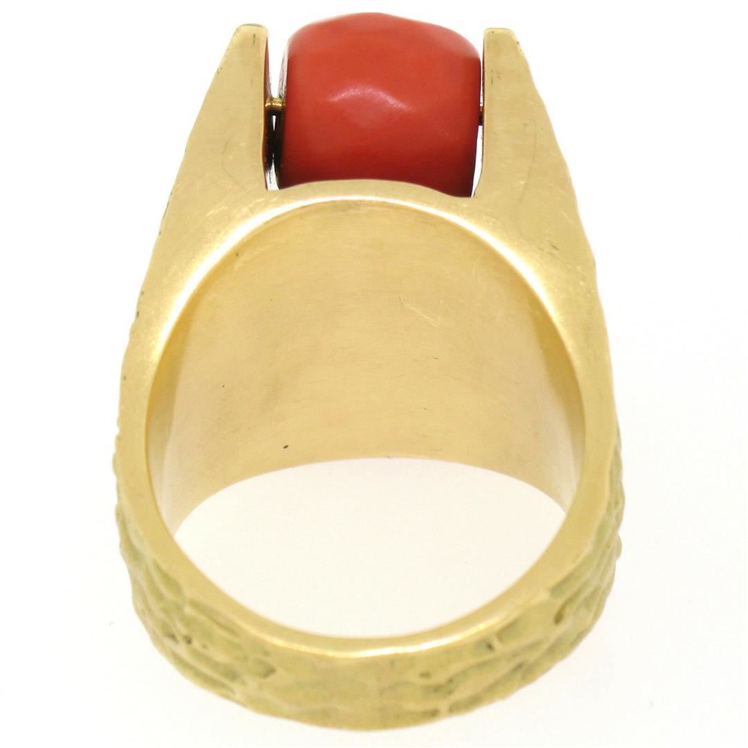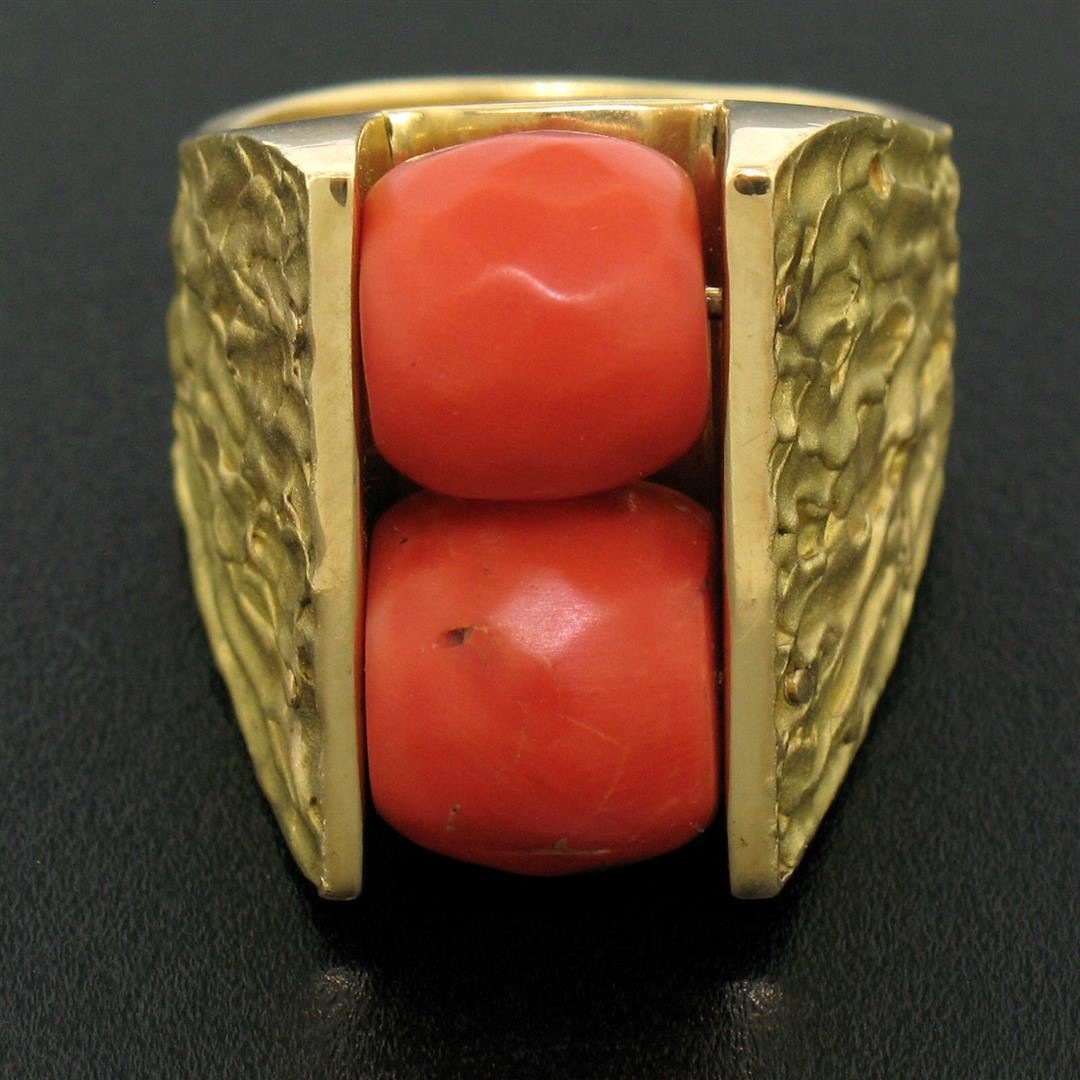 One 18k Yellow Gold Two Spinning Faceted Coral Bead Ring Textured Matte Finish 40.1g. Item Details: Material: Solid 18K Yellow Gold, Weight: 40.1 Grams ( VERY SOLID AND HEAVY), Stone(s): (2) Natural Genuine Coral - Round Bead Shape - Deep Red Color - 9.5-10.9mm (approx.), Ring Size: 8 , Ring Width: 20.75mm, Ring Height: 12.93mm rise off the finger, Condition: Like New!,