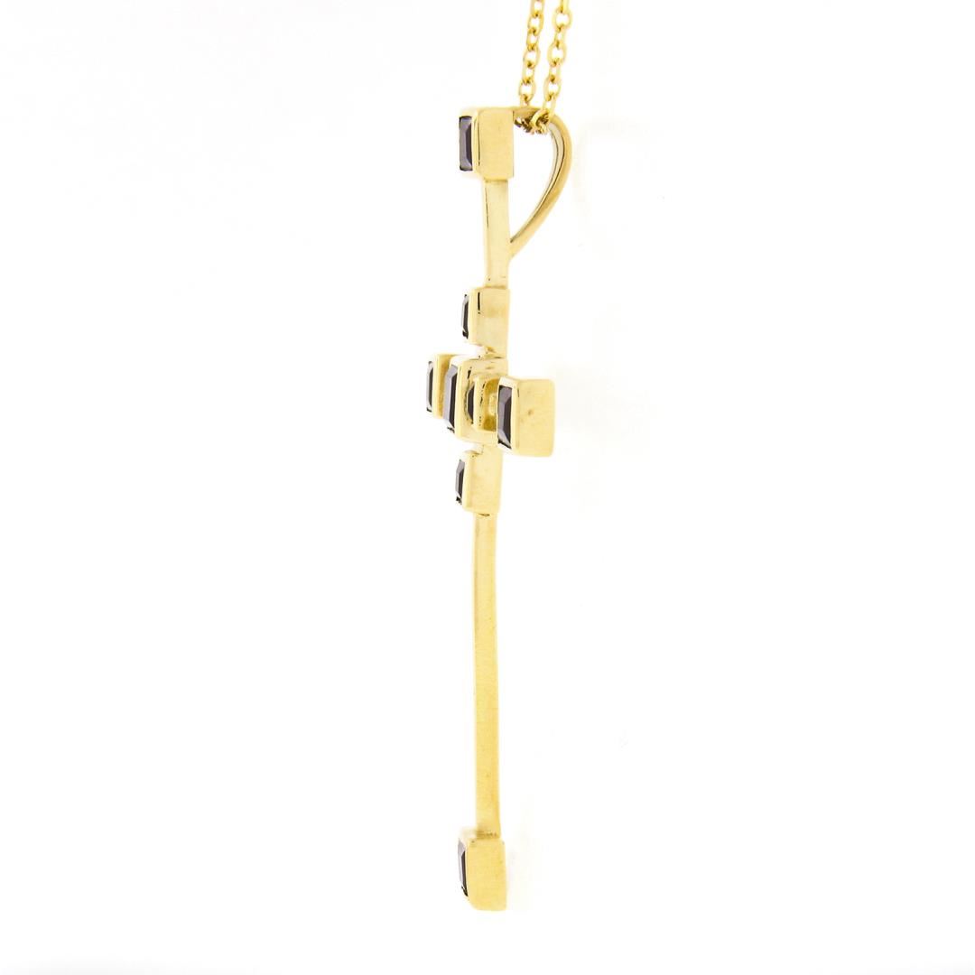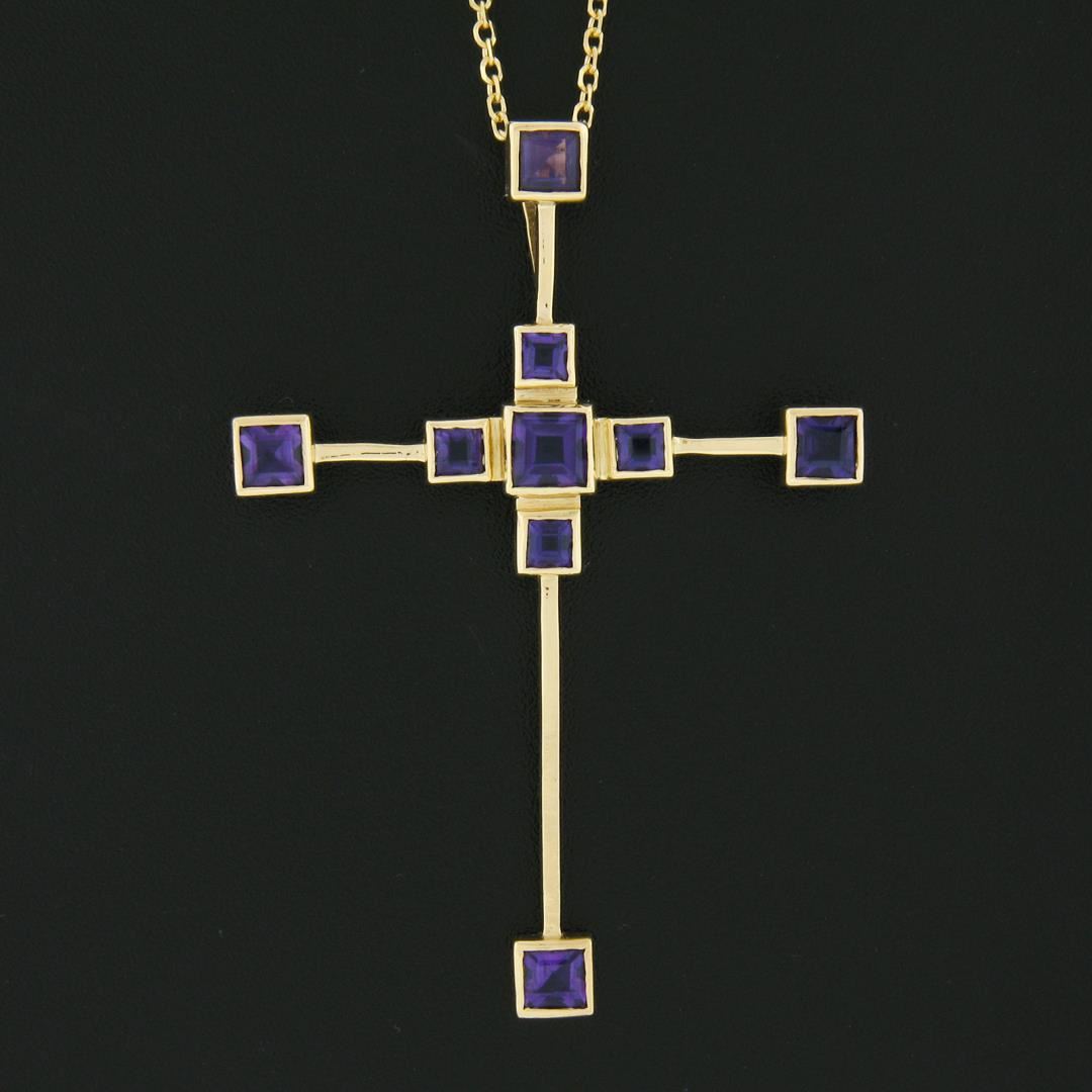 A solid 18k Yellow gold cross pendant necklace, with 9 square cut natural amethysts (3.3x3.3mm to 4.9x4.9mm each). 18 inch cable link chain, 11.35 grams total weight, pendant measures 58.90x41.30mm.