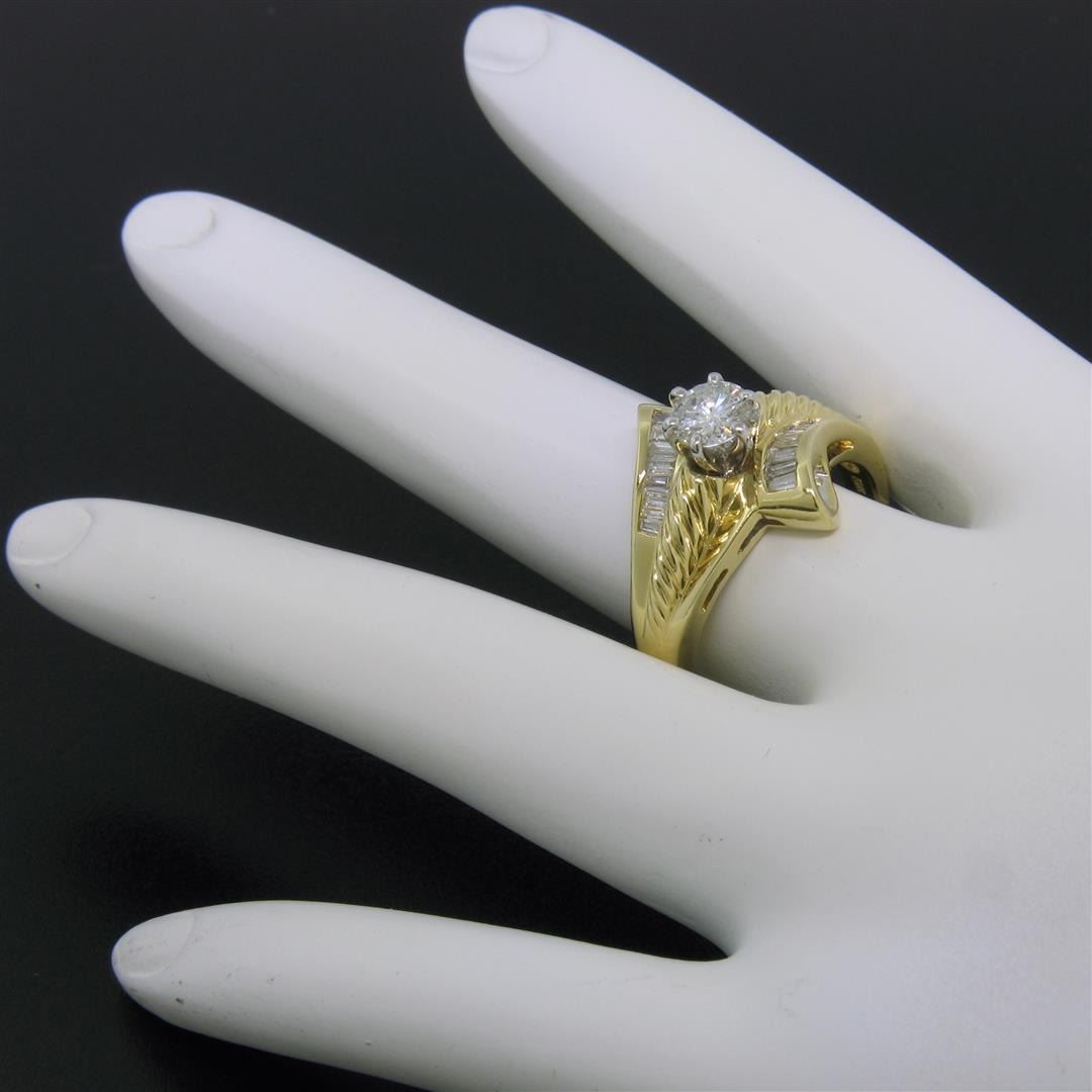 An 18k yellow and white gold diamond bypass ring with a 0.53ct round solitaire (G - I1) and 0.37ctw of baguettes (G/H - VS2). The ring is size 8.5, weighs a total of 7.5 grams, and measures 16.5mm wide.