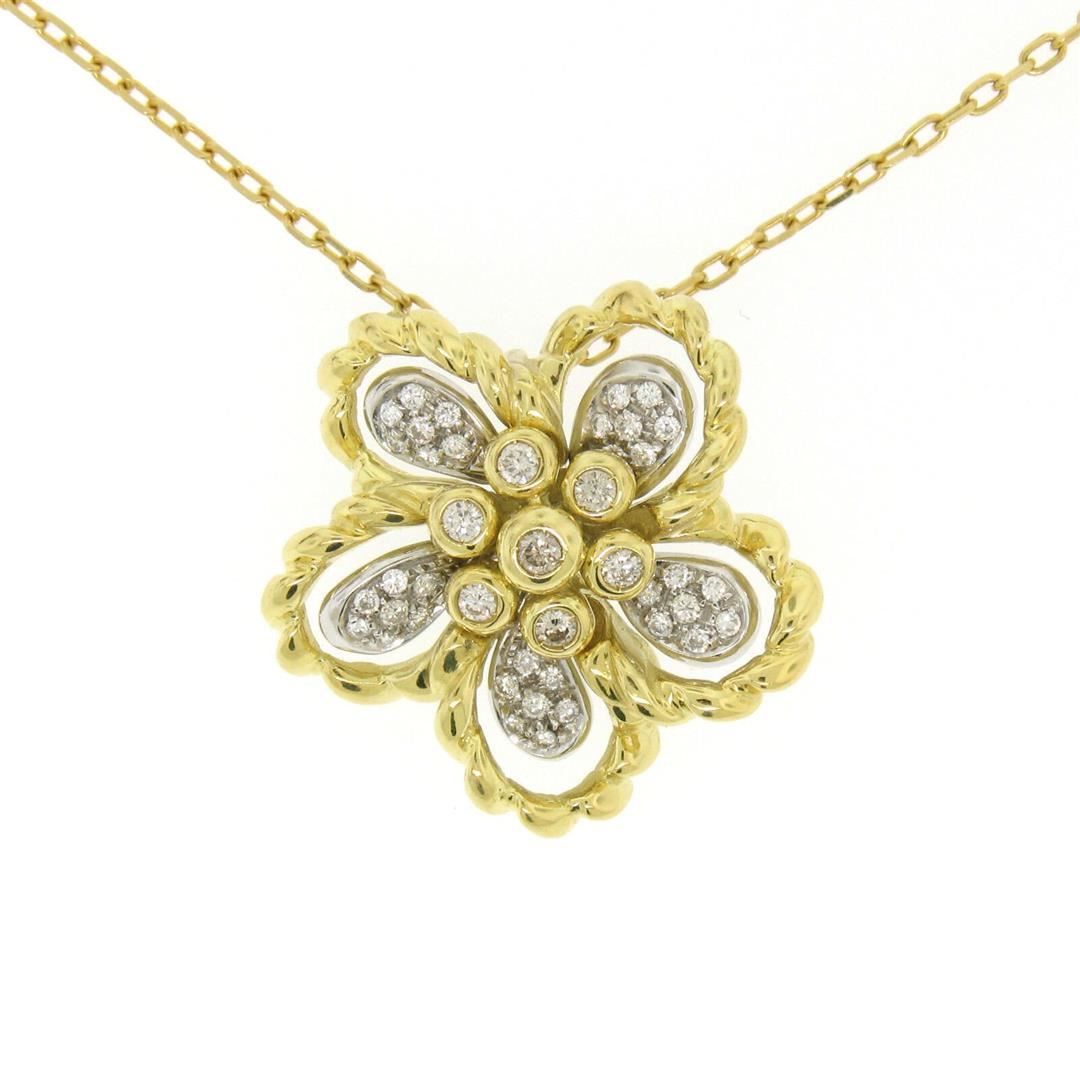 An excellent condition 18kt yellow and white gold flower pendant necklace with 1.22ctw of round diamonds (F - VS1). 20 inch cable link chain, 14.7 grams total weight, measures 27.7x27.0mm.