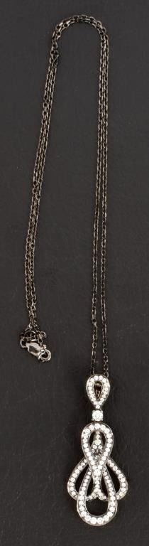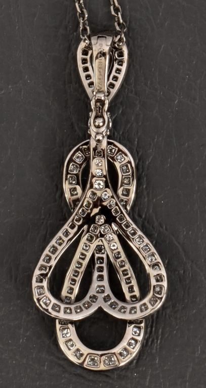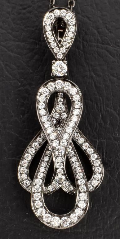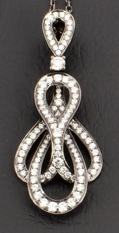 With appraisal: "One 18kt. black rhodiumed gold and diamond necklace. The pendant features a knotted design and contains one hundred and eighteen (118) round brilliant cut diamonds with a total approx. weight of 1.50 cts. The diamonds have an approx. color of G and an approx. clarity of VS1-VS2. The pendant hangs on an eighteen inch diamond cut cable chain measuring about 0.8mm. The necklace weighs 9.4 grams. Approx. Appraised Value $5,950.