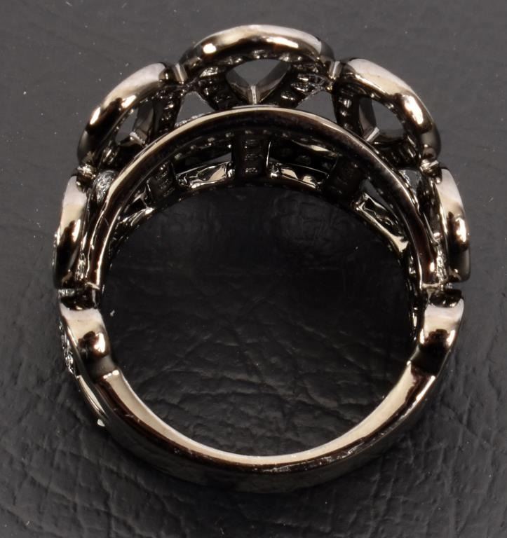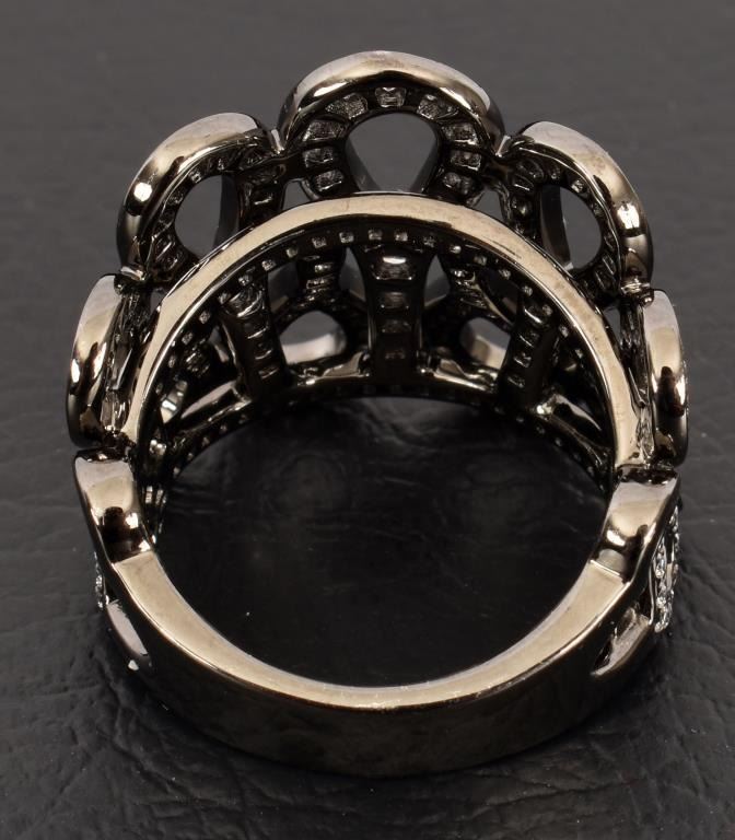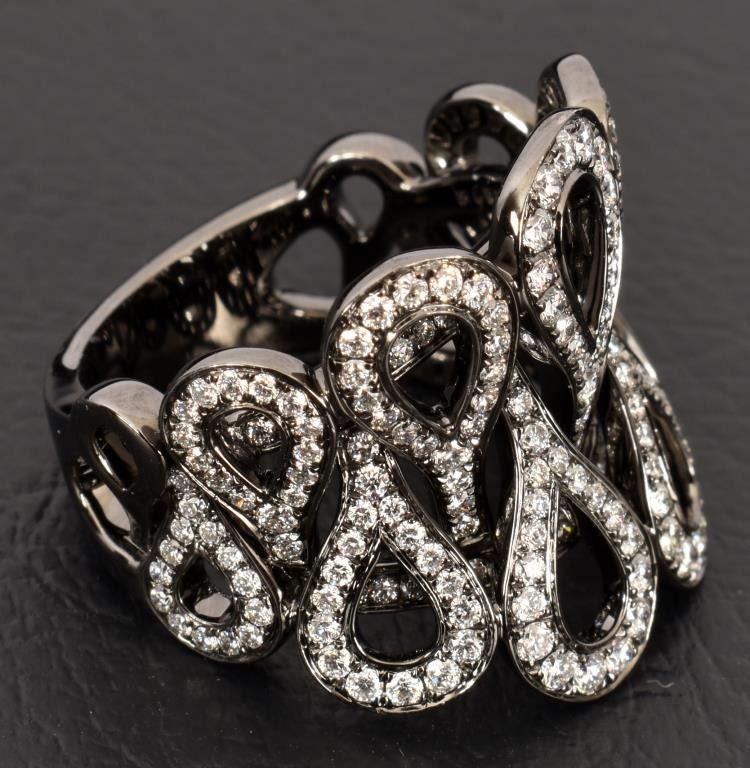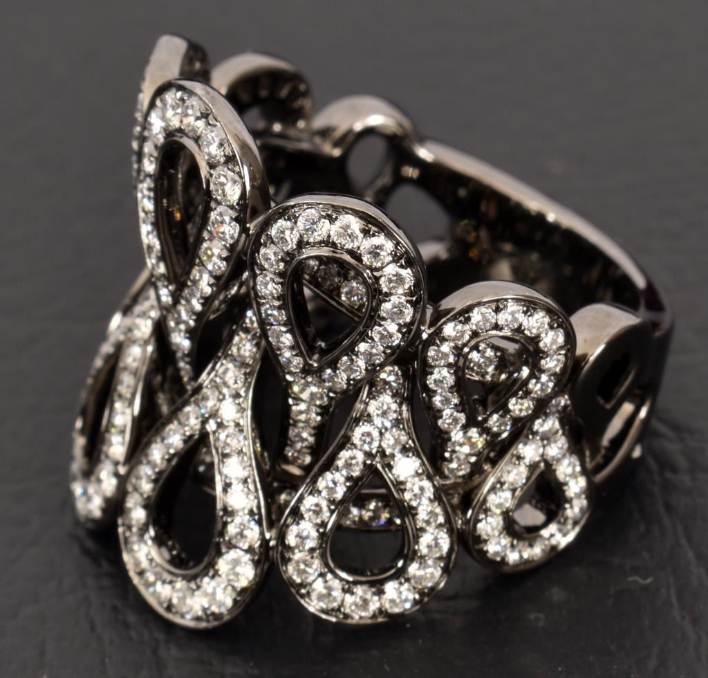 With appraisal: "One 18kt black rhodiumed gold diamond ring. The ring contains two hundred and thirty-four (234) round brilliant cut diamonds with a total approx. weight of 1.50 cts. The diamonds have an approx. color of G and an approximate clarity of VS1-VS2. The ring weighs 13.0 grams. Approx. Appraised Value: $5,950."