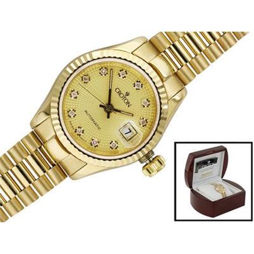 18kt yellow gold .07ctw round diamond accent ladies quartz croton watch. this piece measures 1 and 1/8 inches in width with a designer clasp. this watch features sapphire crystal, date magnifier at 3 o'clock and a screw down crown. this watch is made in italy.