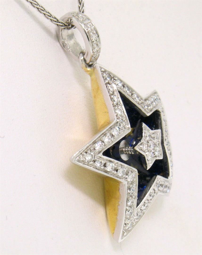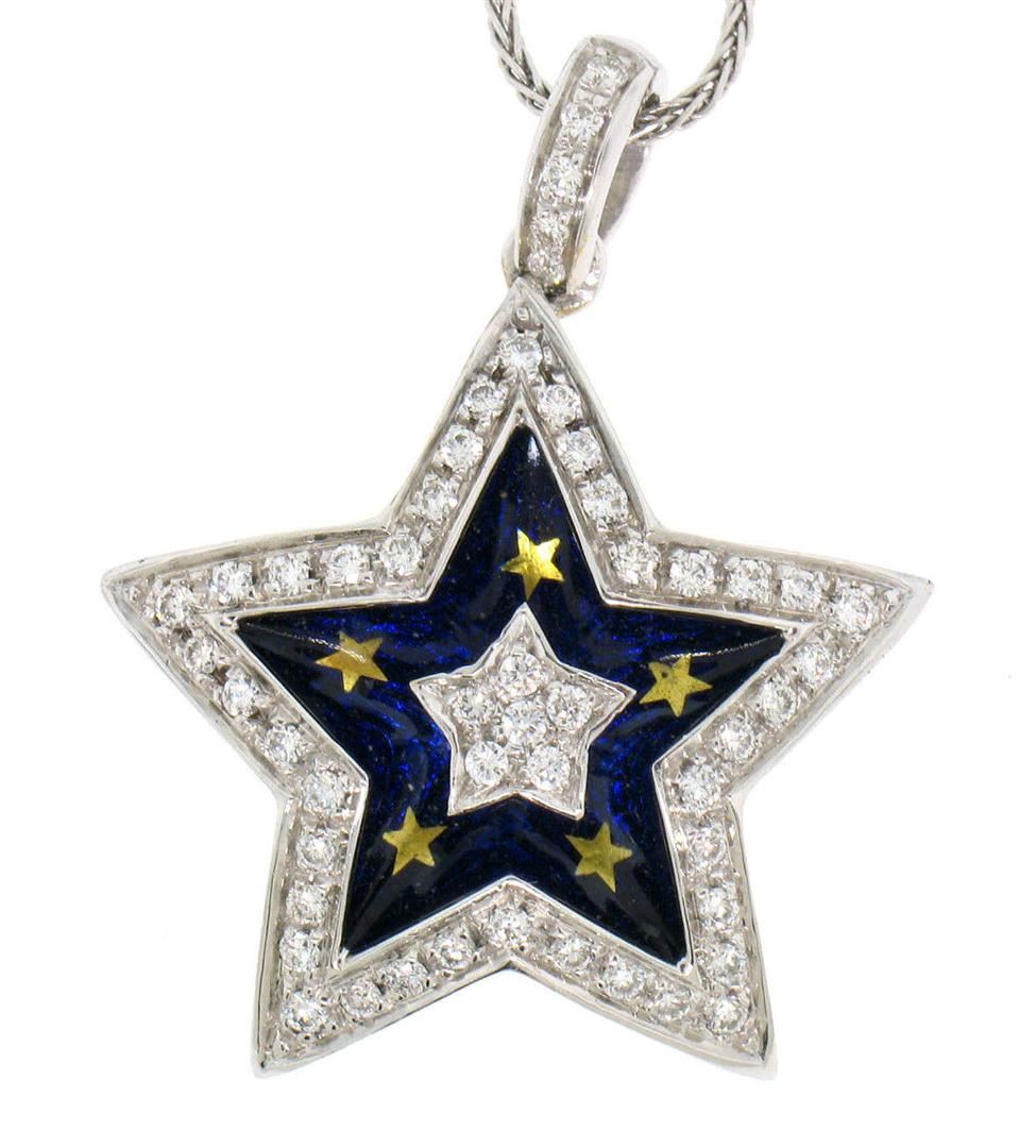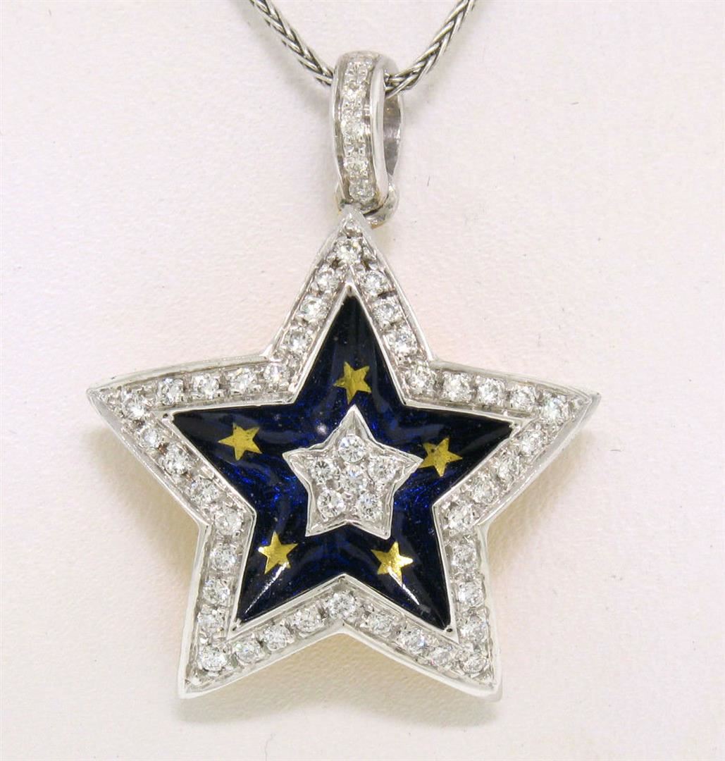 An 18kt white and yellow gold pendant necklace featuring a five-pointed star set with 1.10ctw of round brilliant diamonds (F/G - VS1/VS2) accented with blue and gold enamel. 18 inch wheat link chain, 12.4 grams total weight, pendant measures 25.18x24.06mm.