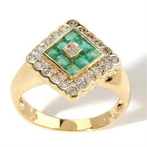 Size 7---Genuine emeralds and diamonds set in 18kt. yellow gold. This ring features .62ctw. emeralds (8 stones princess cut green emeralds) and .30ctw. diamonds (21 round, SI1-SI2 diamonds).