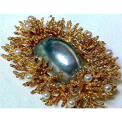 Designer 18kt Yellow Gold Mother Pearl & Natural Pearl Lady's Coral Form Brooch; illegibly signed the makers name, Italy, 18kt on the pin in the back, set with eleven 4mm natural white pearls and a center mother pearl which measures in at 29 x 18 x13mm in size. This rare and unique broach is marvelously crafted and jumps out at you as if it was real coral and would a splendid gift that special someone will never forget. <P>Size: 2.165 x 1.75 inches,