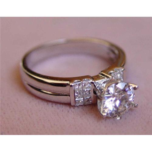 With a nice old miner H-J color, VS1 clarity center stone, with a small carbon inclusion, weighing approximately 1.11ct in an 18kt white gold setting adorned with 6 brilliant white princess cut diamonds flanking both sides weighing approximately .25ct, making the total diamond weight approximately 1.36cts. This elegant ring comes with a nice presentation box and would make the perfect engagement ring for that special someone. The 3rd images shows the setting prior to being mounted with the center stone.