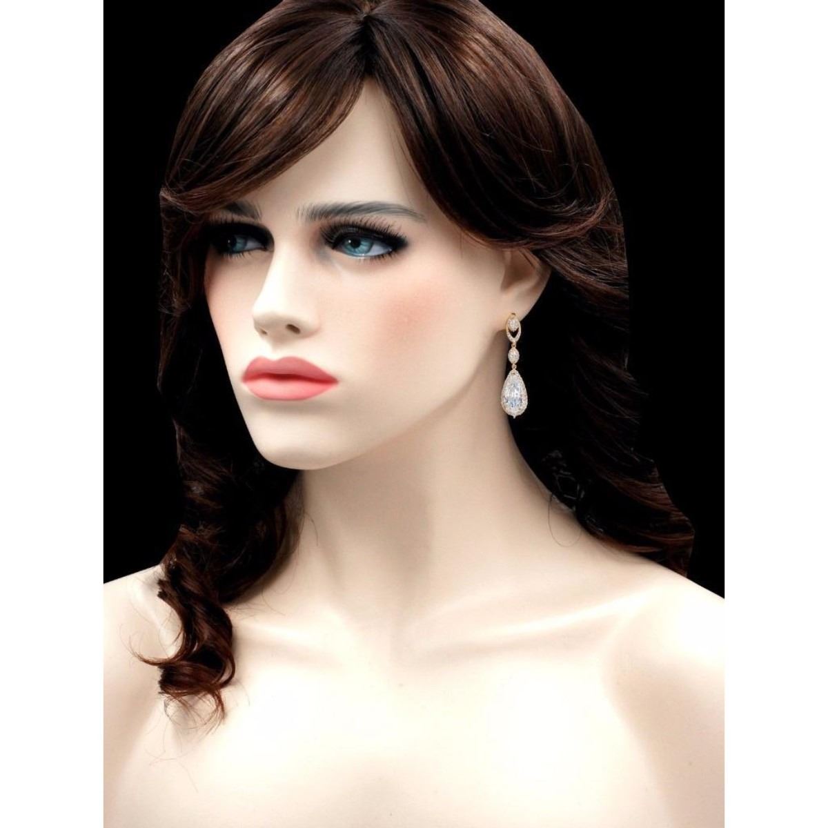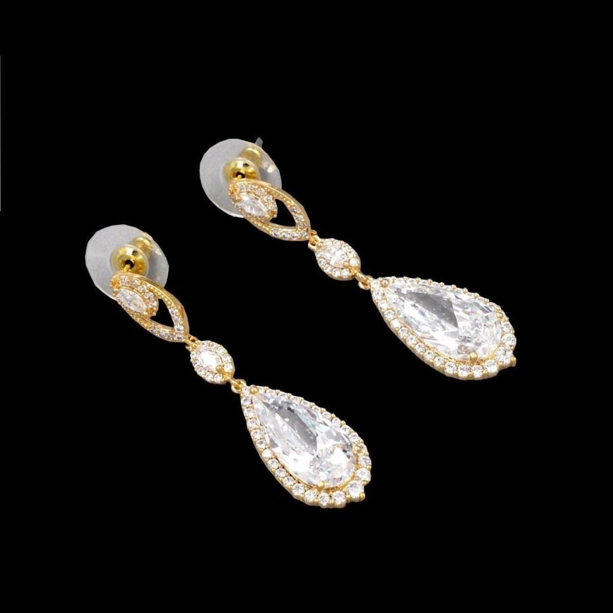 Clear pear & marquise shaped cubic zirconias, set in 18kt gold plated copper bridal drop earrings. 1.875" L. Â