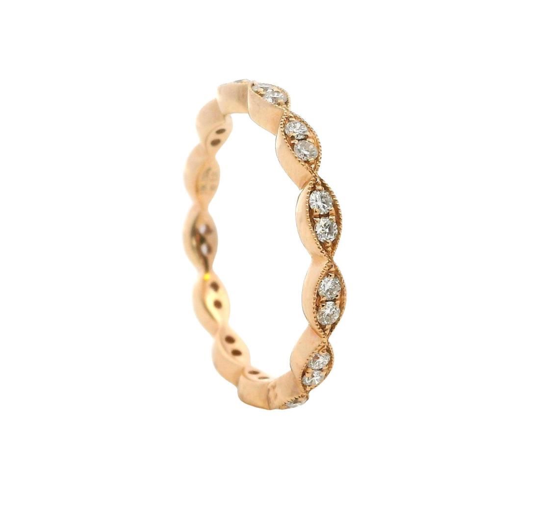 A delicate 18KT rose gold eternity band with a scalloped shank, adorned with twenty-six prong-set round brilliant-cut diamonds totaling 0.31ct. Each diamond, graded F-G in color and VS-1 to VS-2 in clarity, is precisely placed to maximize sparkle. The milgrain detailing along the band adds a vintage-inspired touch to this timeless design.