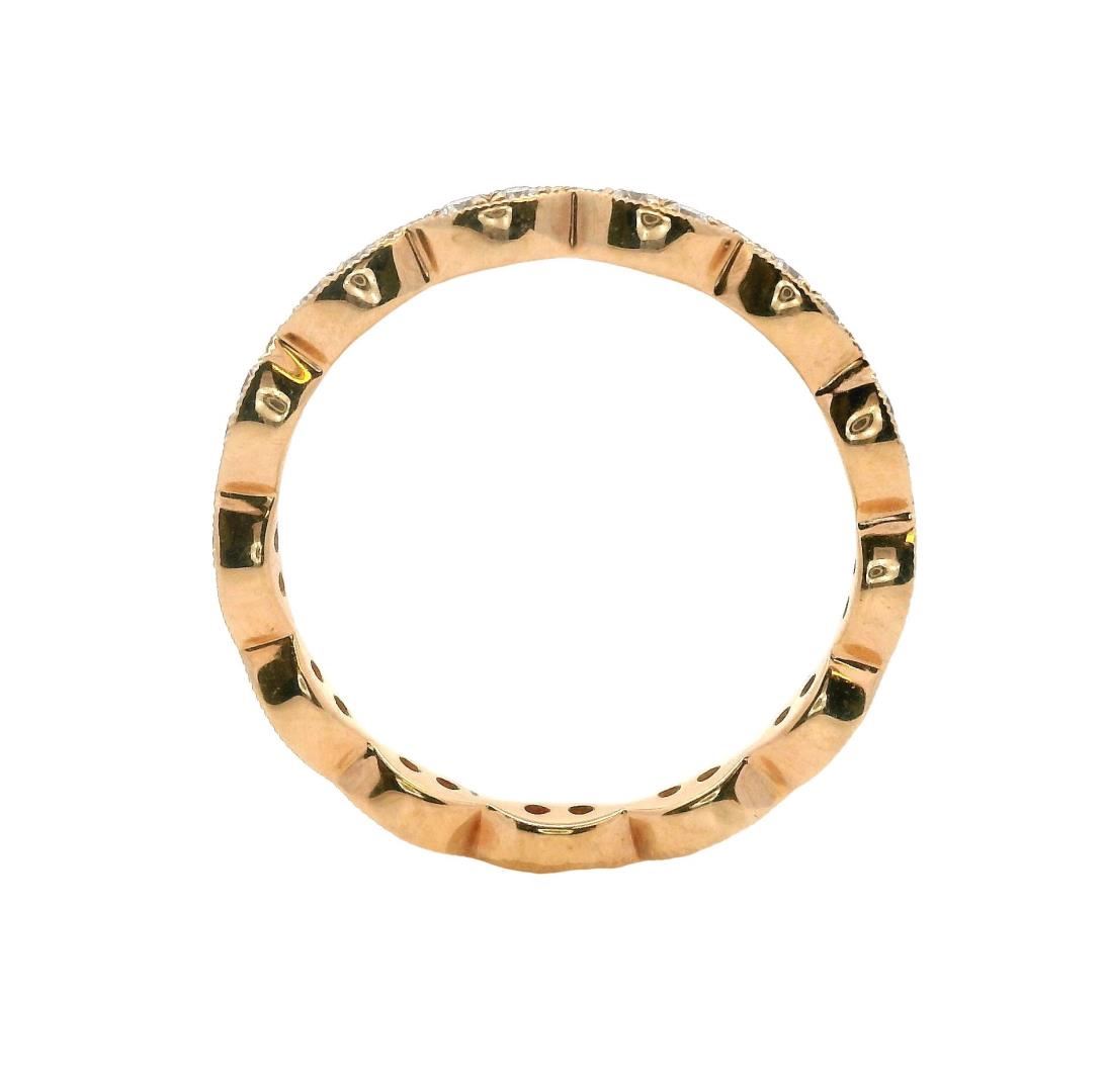 A delicate 18KT rose gold eternity band with a scalloped shank, adorned with twenty-six prong-set round brilliant-cut diamonds totaling 0.31ct. Each diamond, graded F-G in color and VS-1 to VS-2 in clarity, is precisely placed to maximize sparkle. The milgrain detailing along the band adds a vintage-inspired touch to this timeless design.