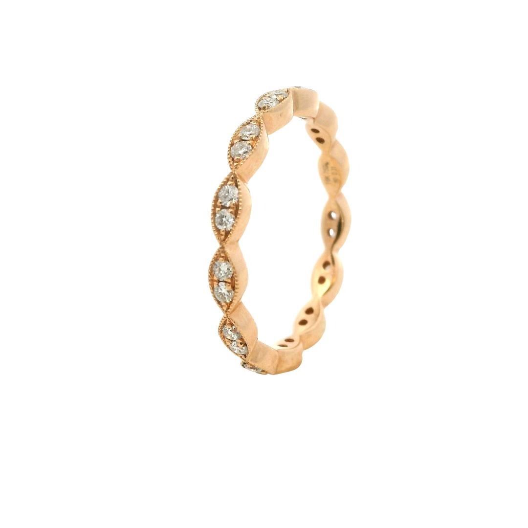 A delicate 18KT rose gold eternity band with a scalloped shank, adorned with twenty-six prong-set round brilliant-cut diamonds totaling 0.31ct. Each diamond, graded F-G in color and VS-1 to VS-2 in clarity, is precisely placed to maximize sparkle. The milgrain detailing along the band adds a vintage-inspired touch to this timeless design.
