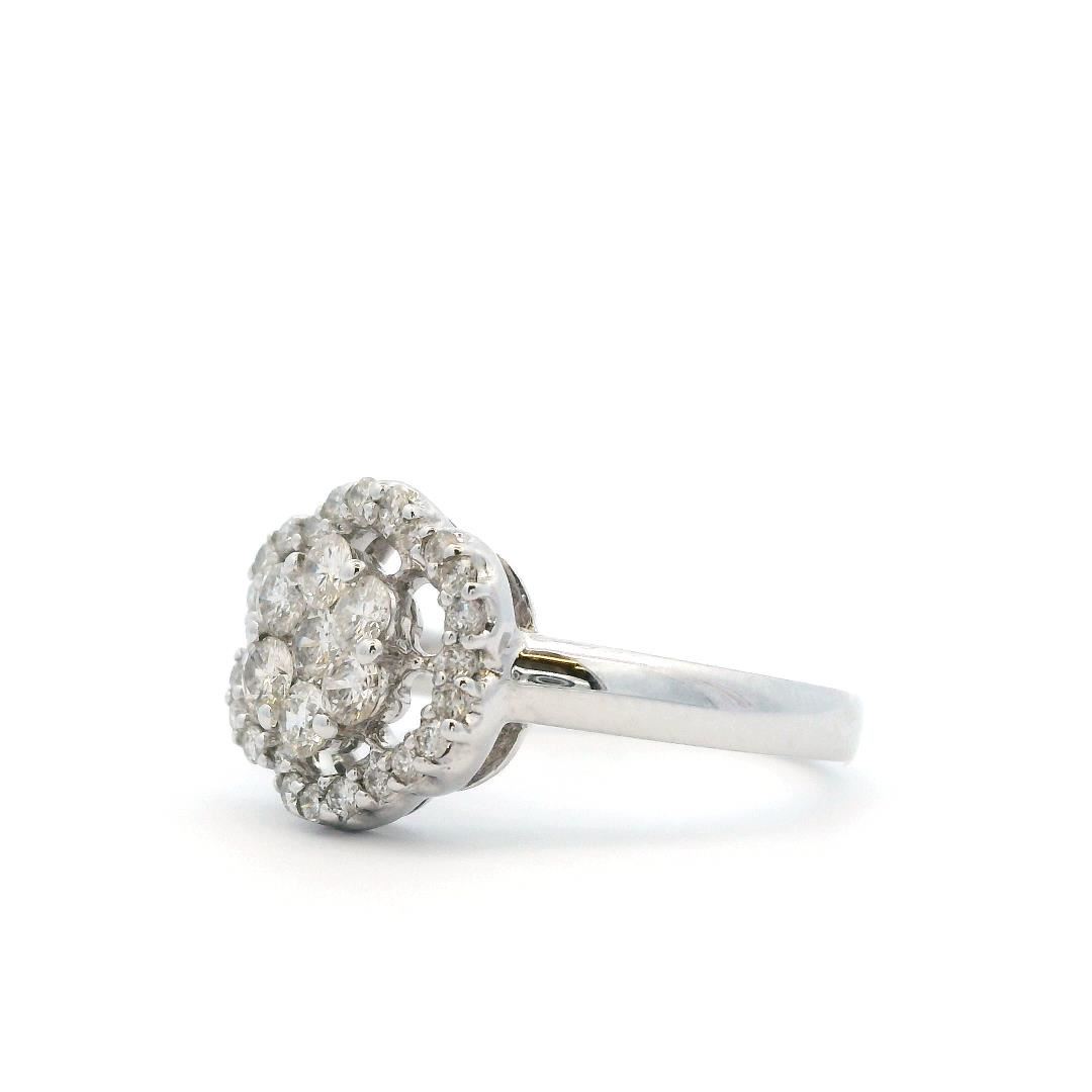 Crafted in 18KT white gold, this floral-inspired ring showcases seven prong-set round brilliant-cut diamonds totaling 0.44ct and twenty-four additional round diamonds weighing 0.20ct. The diamonds are graded G-I in color and VS-2 to SI-1 in clarity, enhancing the intricate floral motif with radiant sparkle.