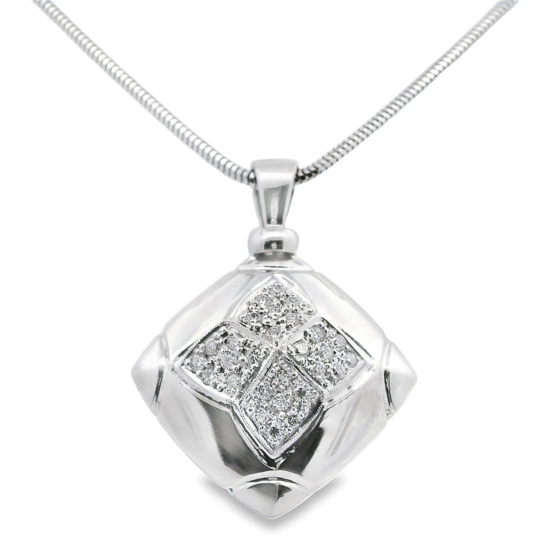 This 18KT white gold square halo pendant necklace features a detailed dome motif and milgrain accents. It is adorned with twenty-eight bead-set round brilliant cut diamonds totaling 0.65ct, graded G-H in color, VS-2 to SI-1 in clarity, and with a very good cut. The pendant and chain weigh 19.10 grams.