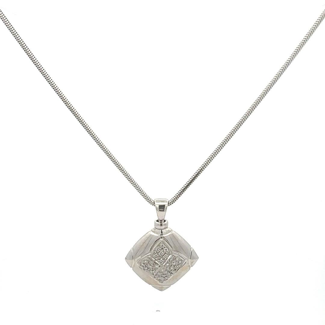 This 18KT white gold square halo pendant necklace features a detailed dome motif and milgrain accents. It is adorned with twenty-eight bead-set round brilliant cut diamonds totaling 0.65ct, graded G-H in color, VS-2 to SI-1 in clarity, and with a very good cut. The pendant and chain weigh 19.10 grams.