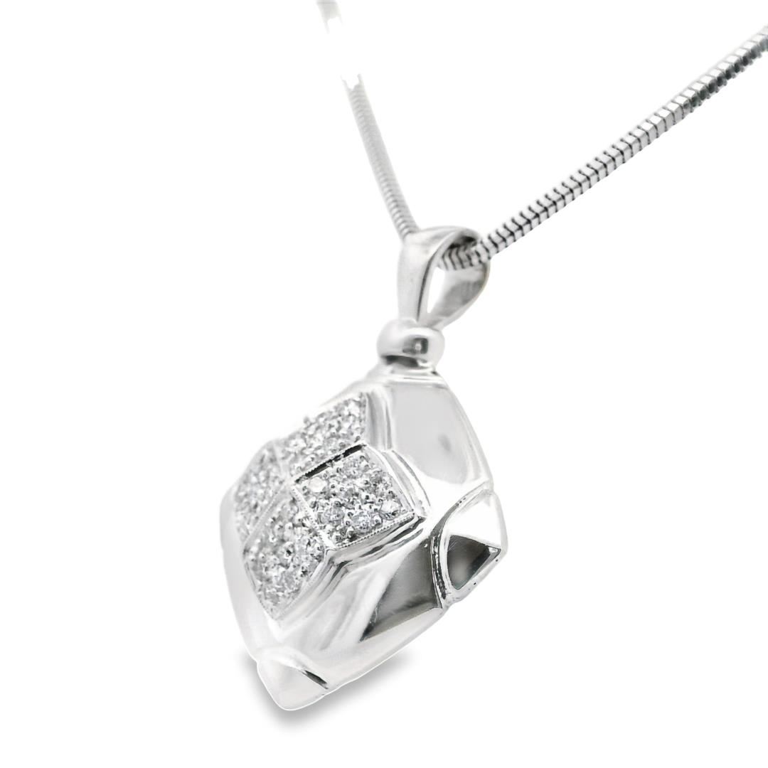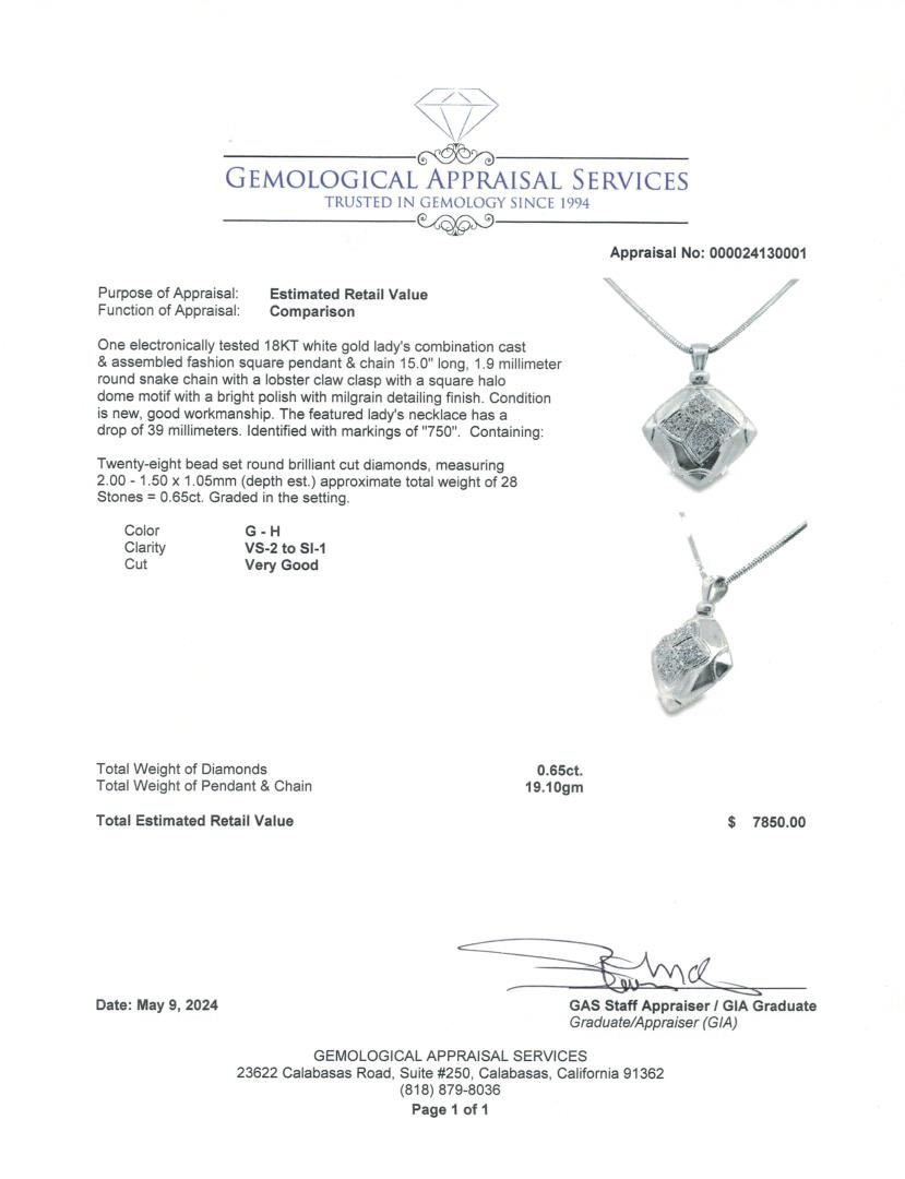 This 18KT white gold square halo pendant necklace features a detailed dome motif and milgrain accents. It is adorned with twenty-eight bead-set round brilliant cut diamonds totaling 0.65ct, graded G-H in color, VS-2 to SI-1 in clarity, and with a very good cut. The pendant and chain weigh 19.10 grams.