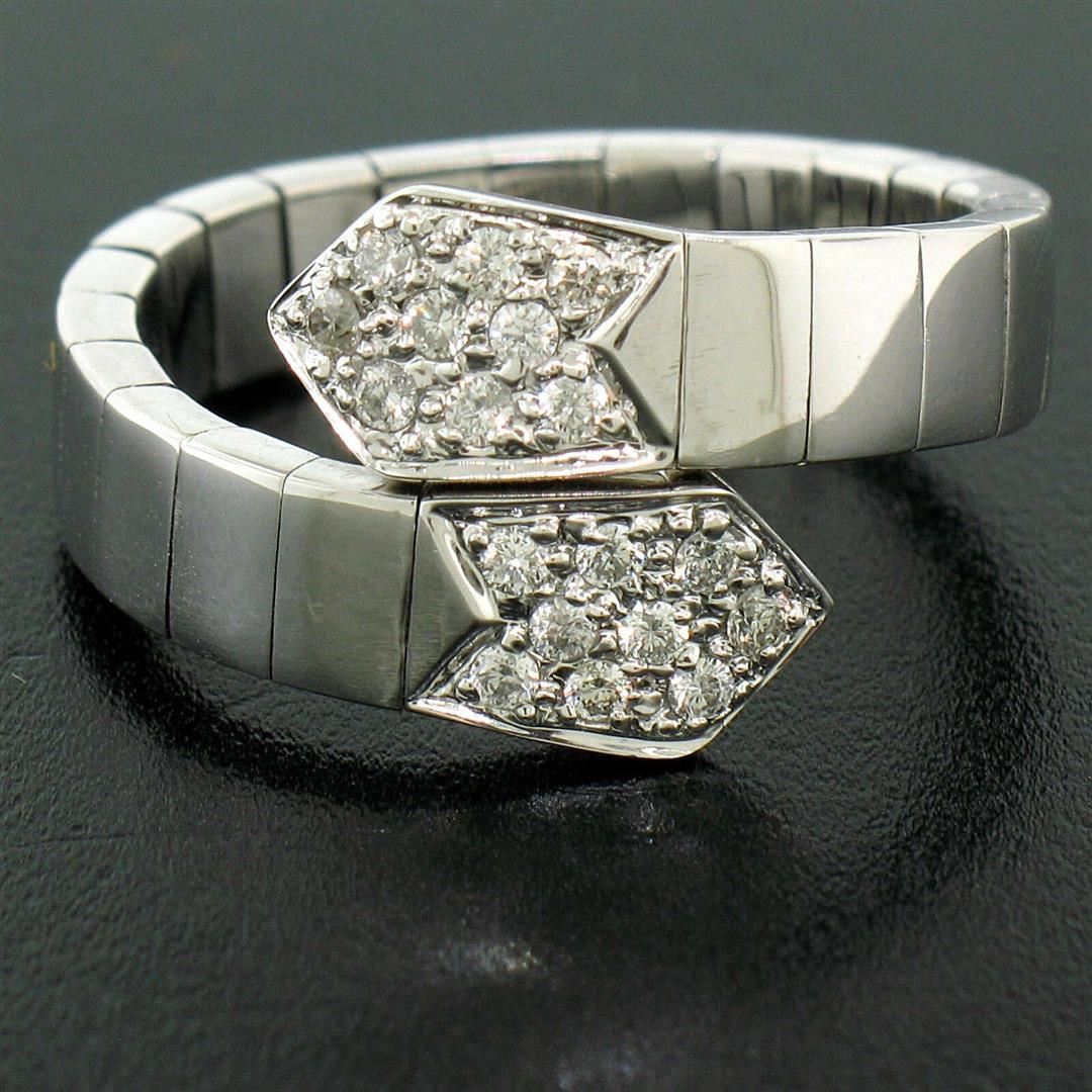 A like new 18kt white gold flexible ring with 0.30ctw of round diamonds (F/G - VS1/VS2). The ring fits sizes 7.5 to 10 comfortably, weighs a total of 7.43 grams, and measures 12mm wide at the top.