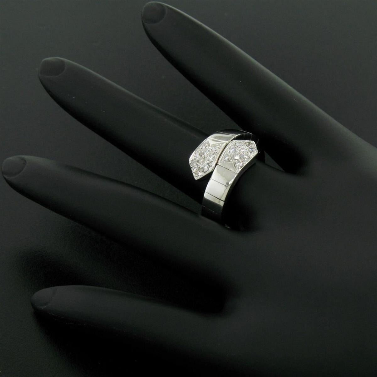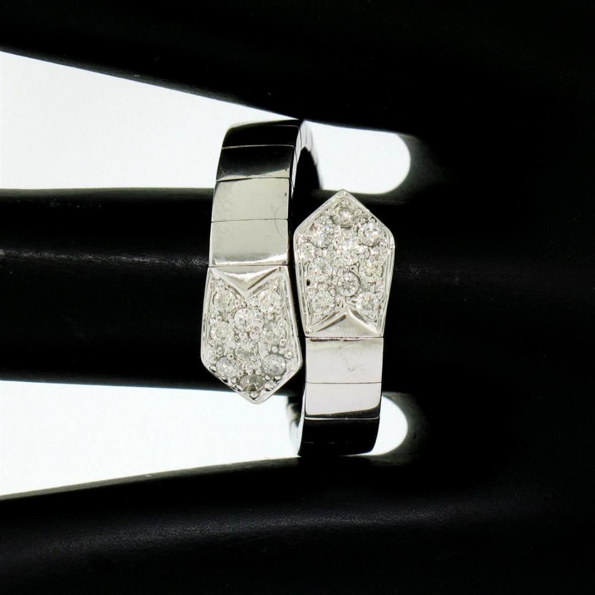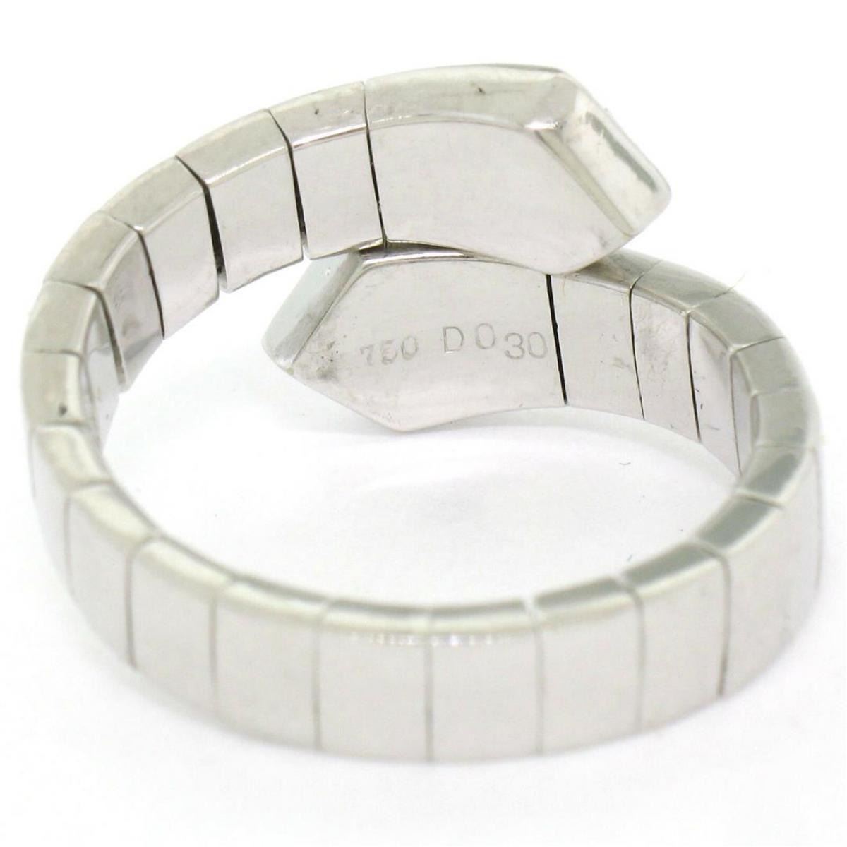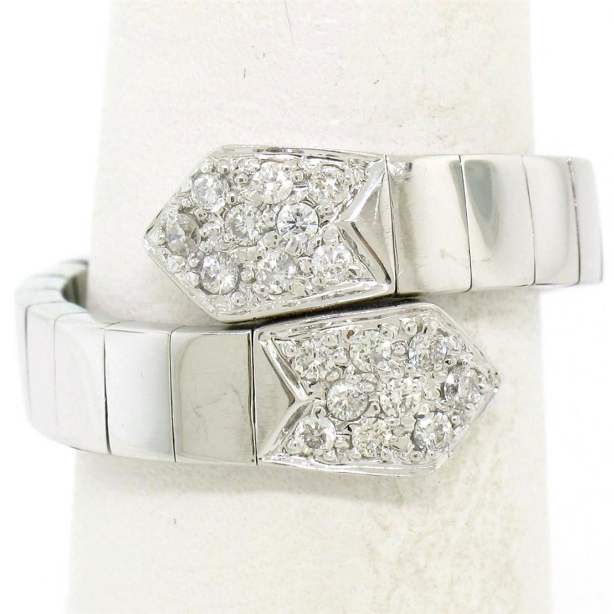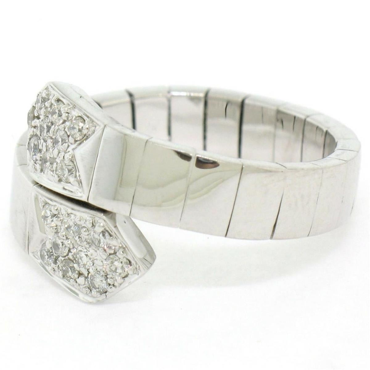 A like new 18kt white gold flexible ring with 0.30ctw of round diamonds (F/G - VS1/VS2). The ring fits sizes 7.5 to 10 comfortably, weighs a total of 7.43 grams, and measures 12mm wide at the top.