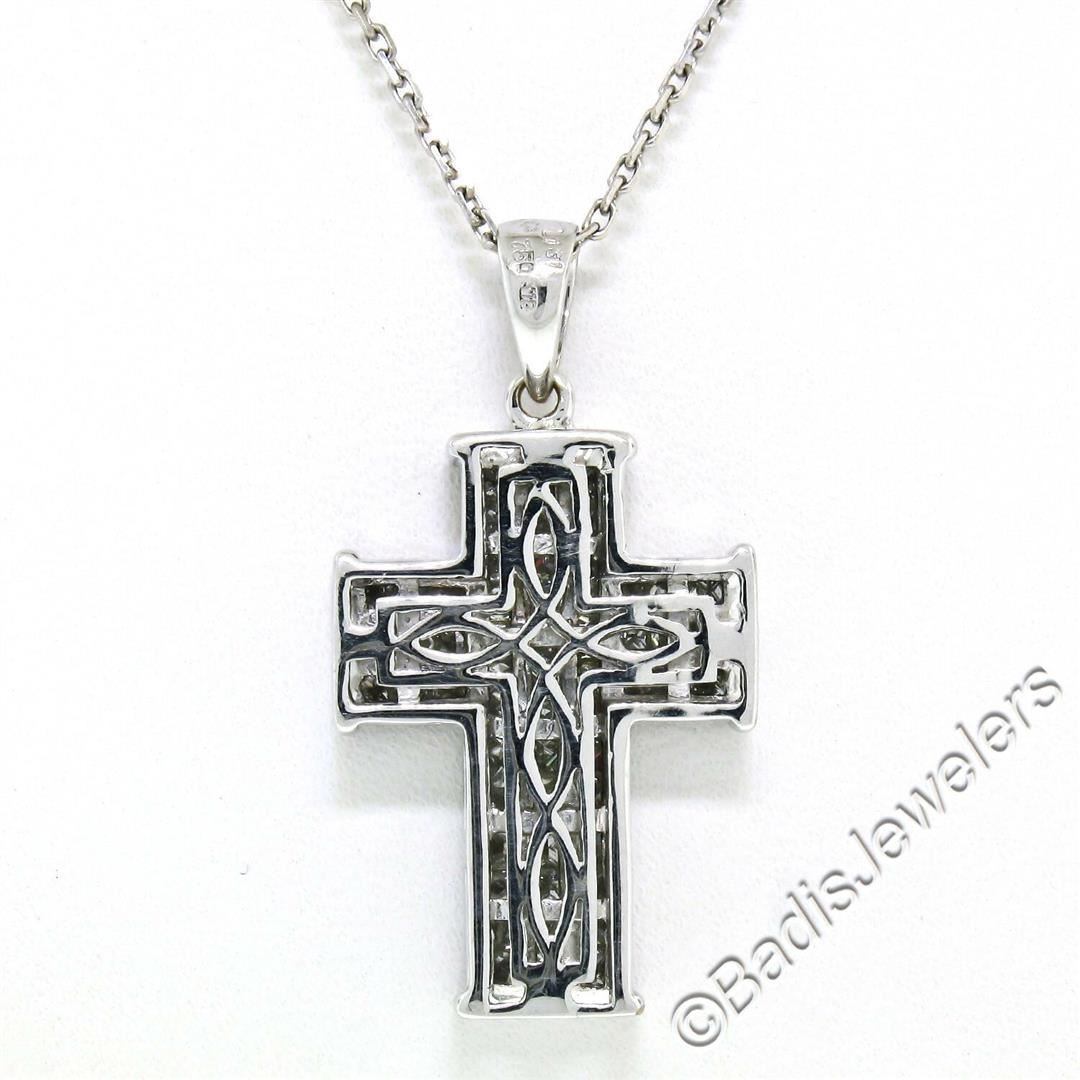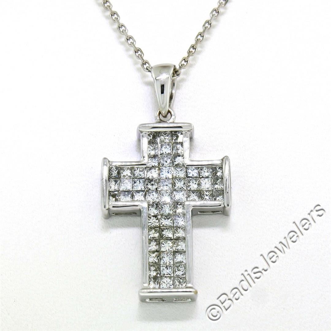 A like new 18kt white gold cross pendant necklace with 1.31ctw of princess cut diamonds. 18 inch cable link chain, 7.27 grams total weight, measures 30.0x16.0mm.