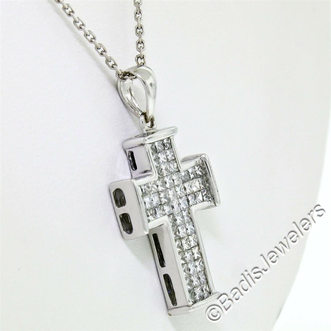 A like new 18kt white gold cross pendant necklace with 1.31ctw of princess cut diamonds. 18 inch cable link chain, 7.27 grams total weight, measures 30.0x16.0mm.