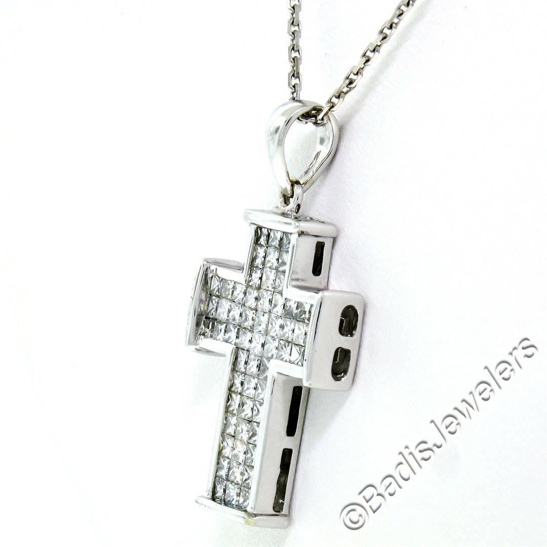 A like new 18kt white gold cross pendant necklace with 1.31ctw of princess cut diamonds. 18 inch cable link chain, 7.27 grams total weight, measures 30.0x16.0mm.