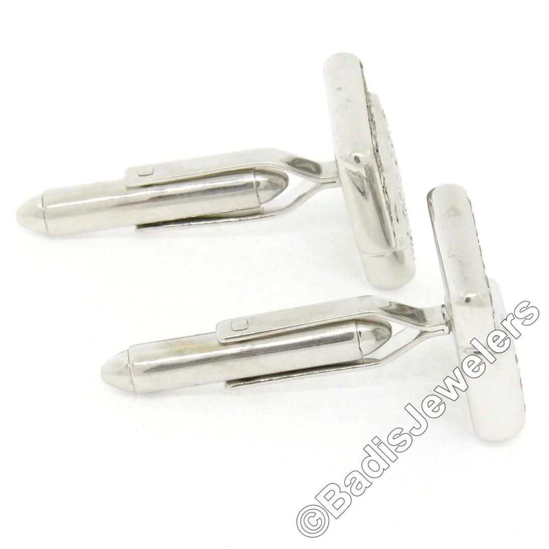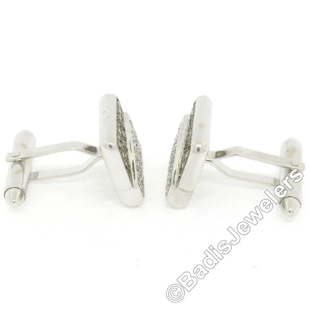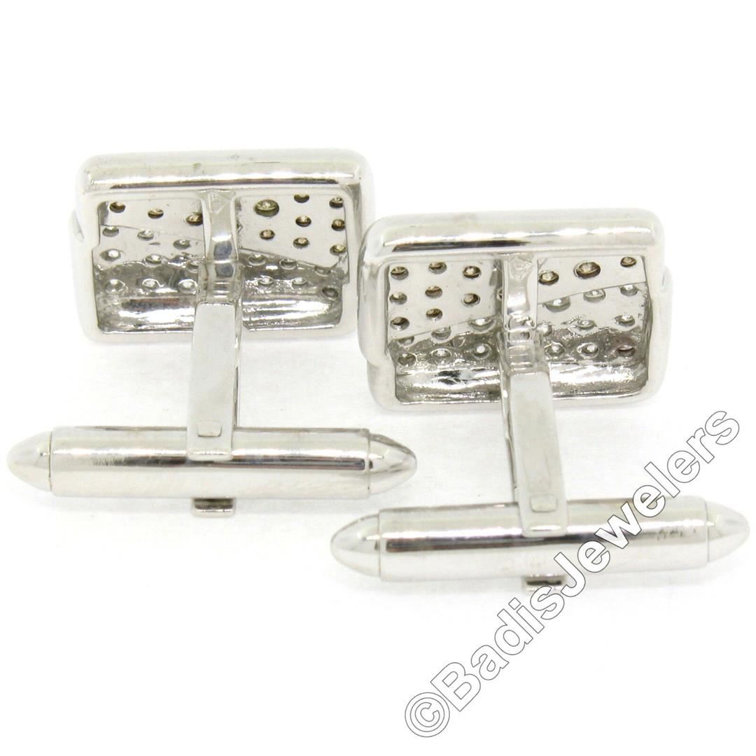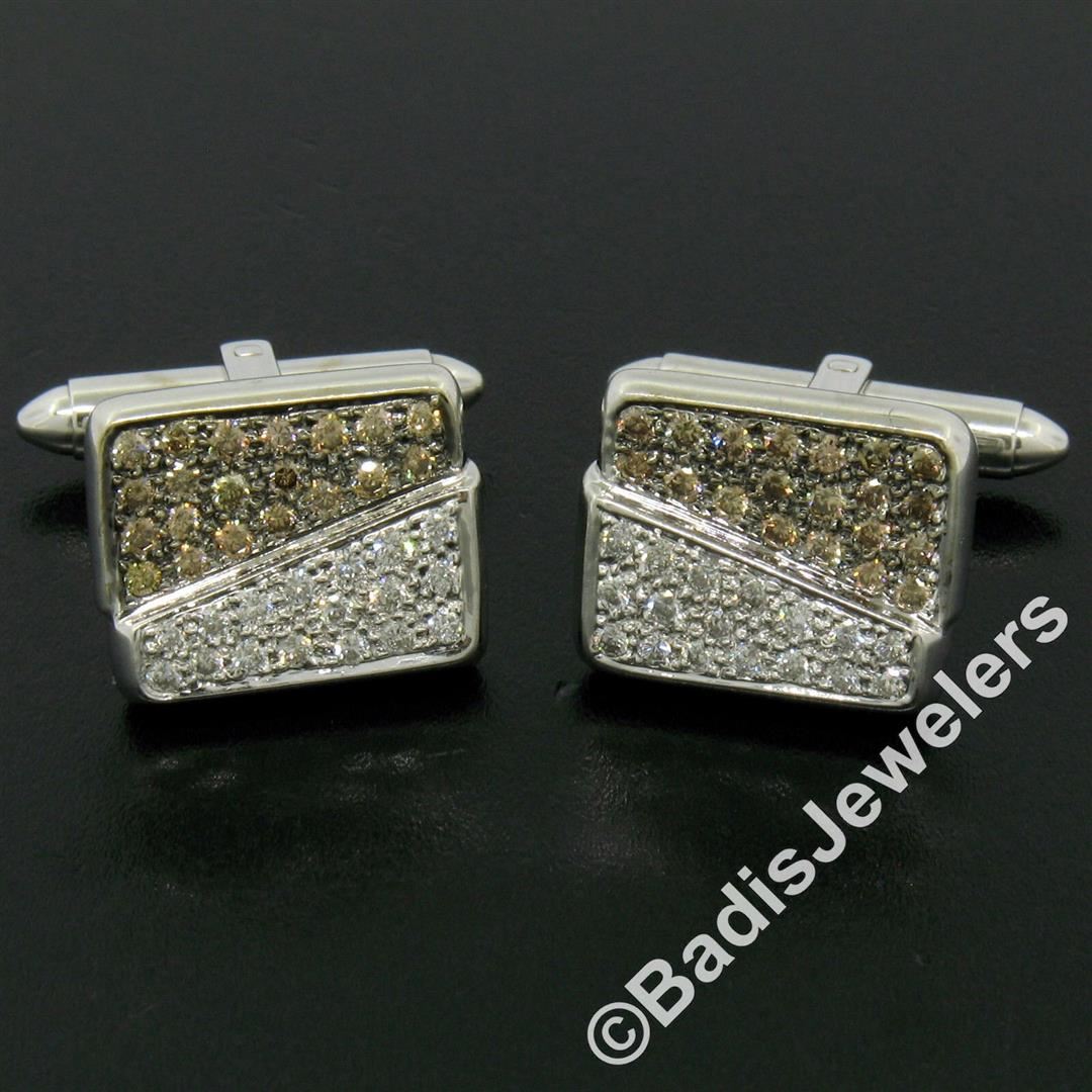 A pair of 18kt white gold cuff links featuring 34 round brilliant white diamonds (G/H - VS2; 0.65ctw) and 40 round brilliant fancy champagne colored diamonds (VS1/VS2; 0.80ctw) pave set throughout their front panels. These cuff links have a swivel back design with a clearence of 12.9mm, weigh a total of 12.41 grams, and the front panels measure 16.97x13.71mm.