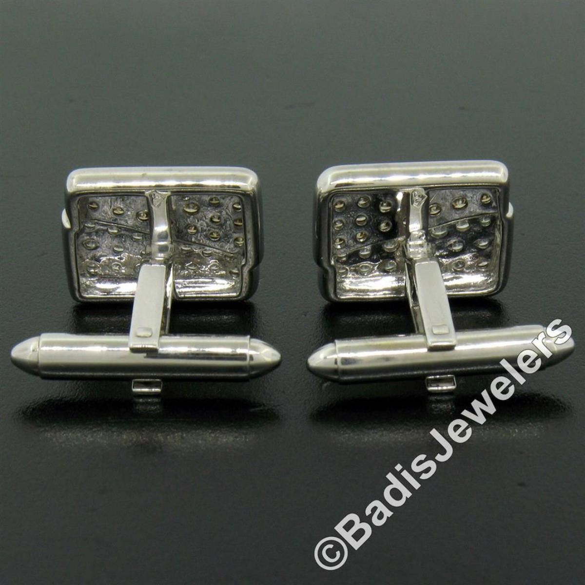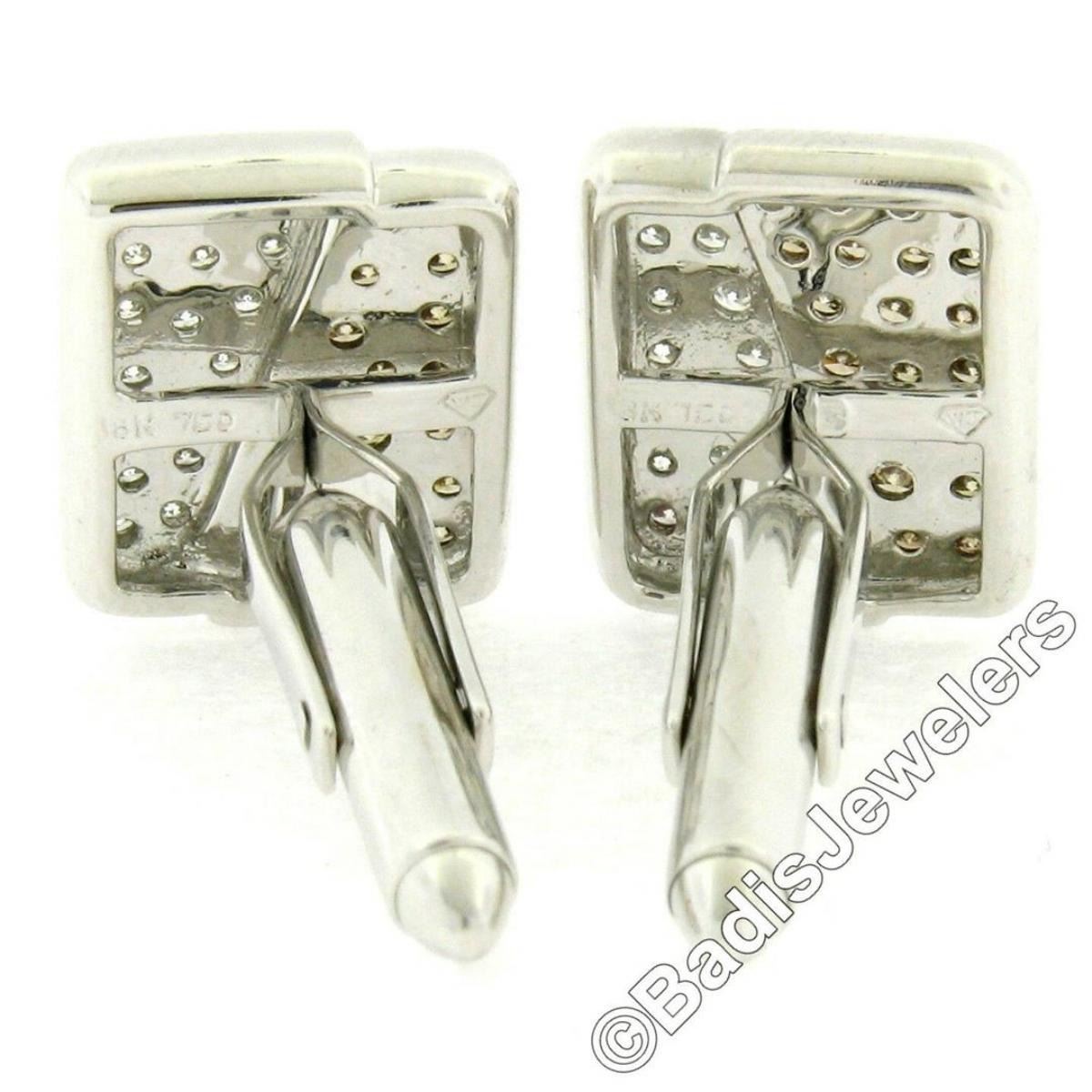 A pair of 18kt white gold cuff links featuring 34 round brilliant white diamonds (G/H - VS2; 0.65ctw) and 40 round brilliant fancy champagne colored diamonds (VS1/VS2; 0.80ctw) pave set throughout their front panels. These cuff links have a swivel back design with a clearence of 12.9mm, weigh a total of 12.41 grams, and the front panels measure 16.97x13.71mm.