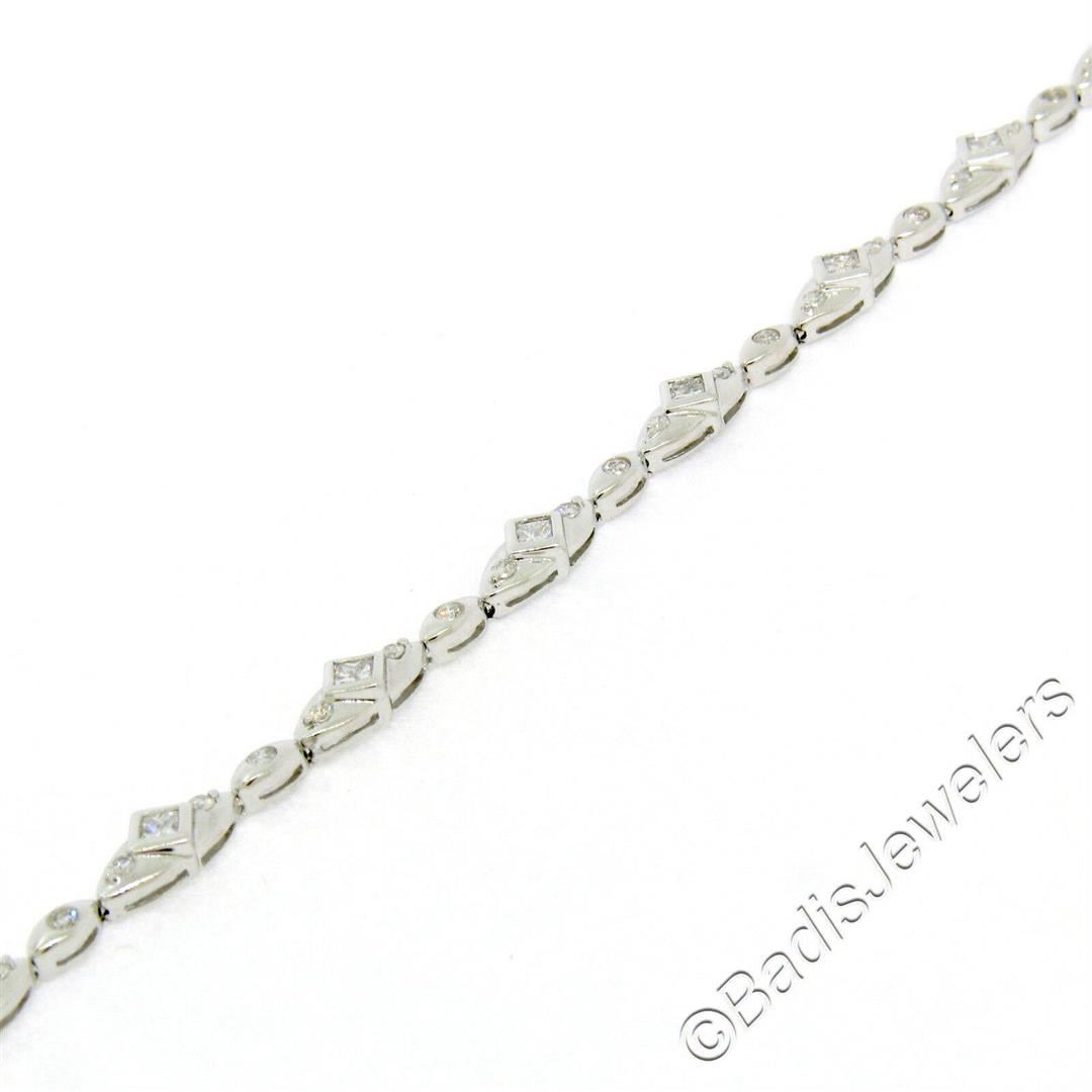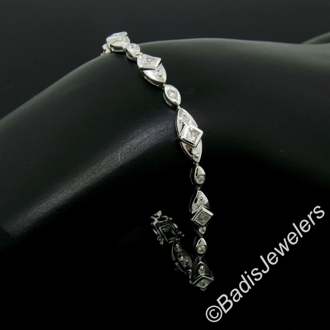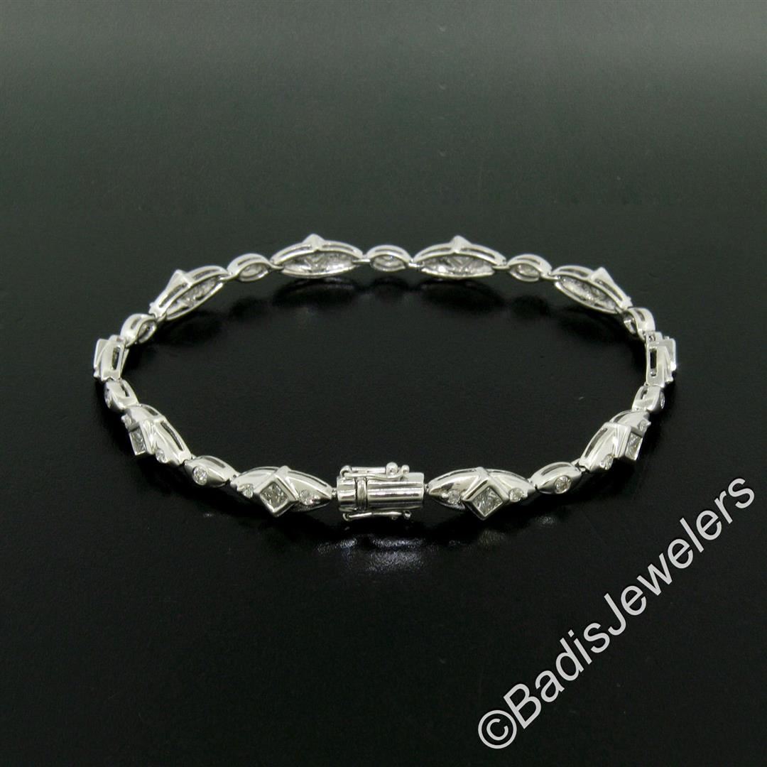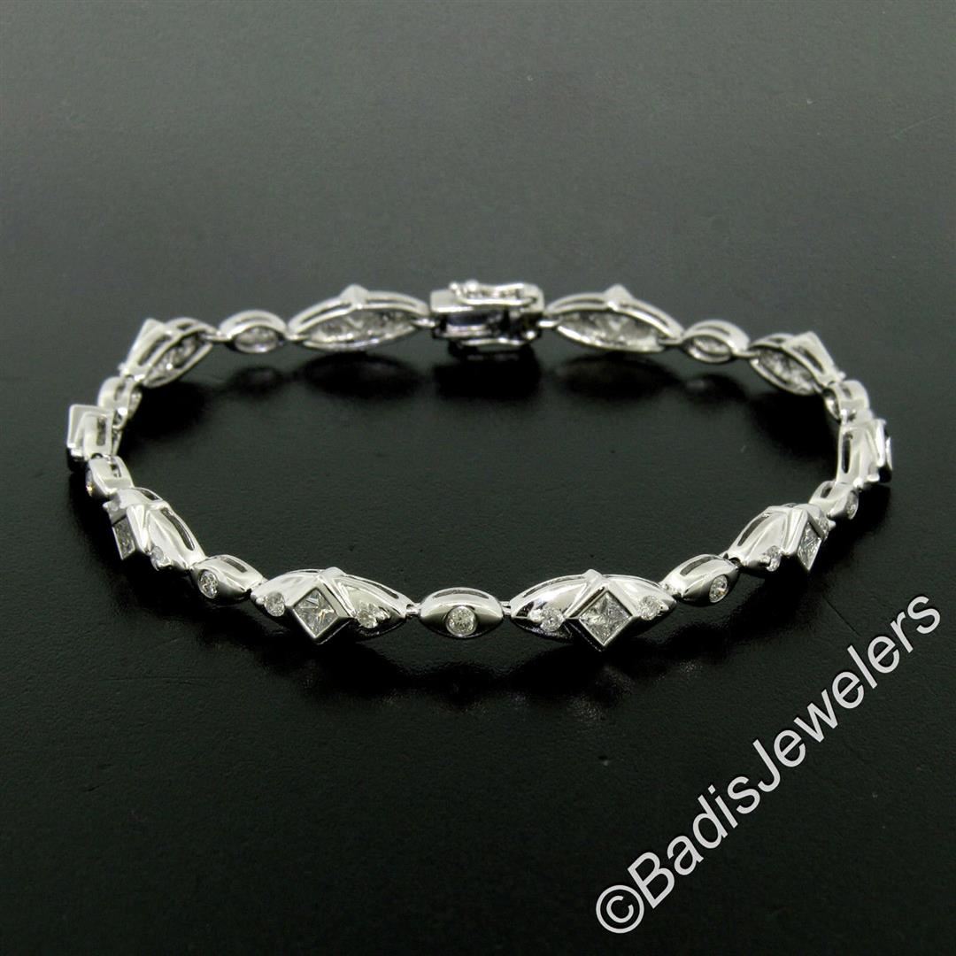 A like new 18kt white gold bracelet set with 1.80ctw of round and princess cut diamonds (G/H - SI1). It weighs a total of 11.17 grams, measures 5.1mm wide, and fits up to a 7 inch wrist.