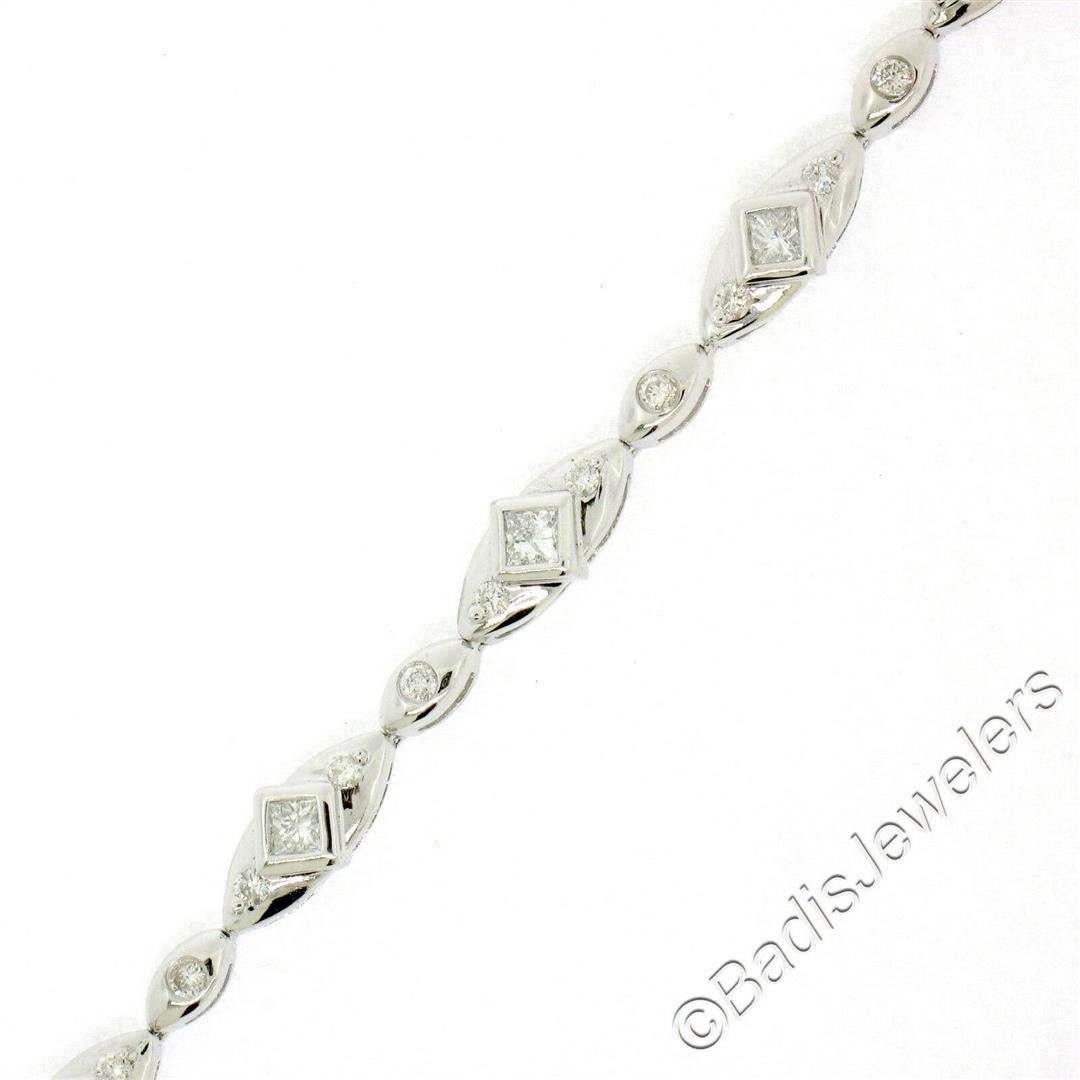 A like new 18kt white gold bracelet set with 1.80ctw of round and princess cut diamonds (G/H - SI1). It weighs a total of 11.17 grams, measures 5.1mm wide, and fits up to a 7 inch wrist.