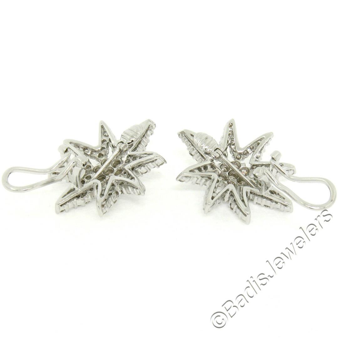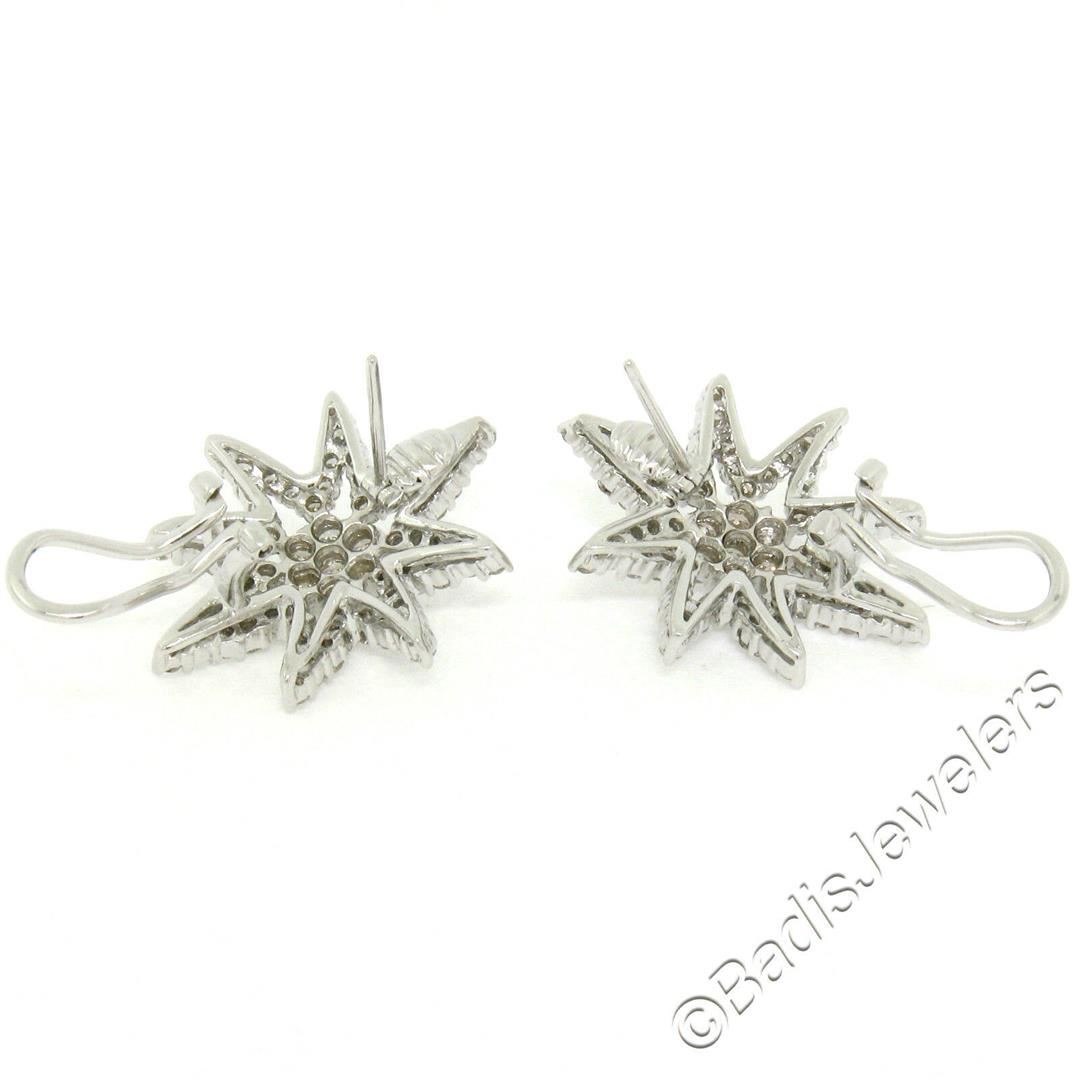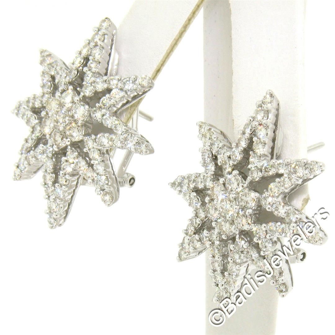 Like new 18kt white gold earrings prong set with 3.35ctw of round diamonds (G/H - VS1/VS2). The earrings have folding posts with omega closures, measure approximately 24.10x28.25mm, and weigh a total of 13.43 grams.