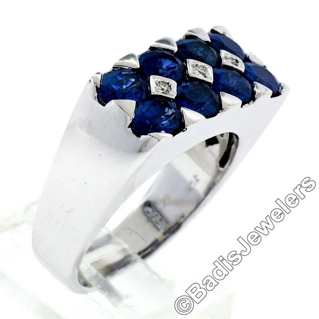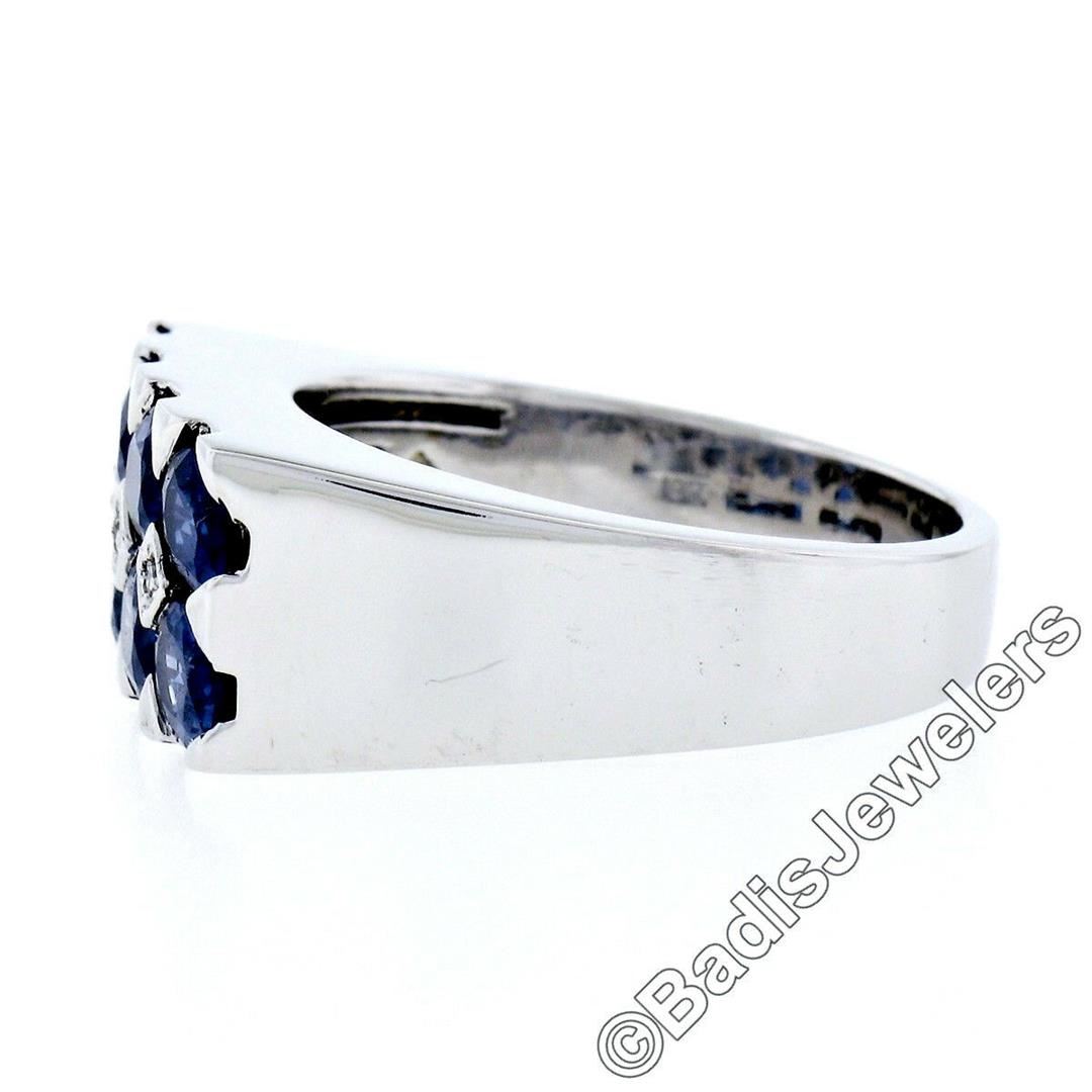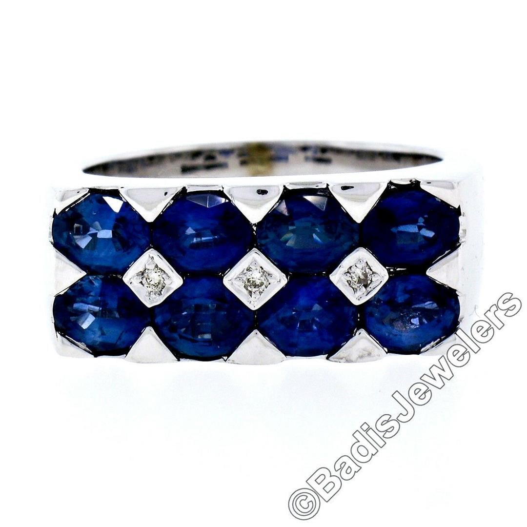 An 18kt white gold band ring featuring 8 oval cut blue sapphires (4.00ctw) bar set in 2 rows and accented by 3 bead set round brilliant diamonds (G - VS2; 0.03ctw). The ring is size 8, weighs a total of 12.22 grams, and measures 9.15mm wide.